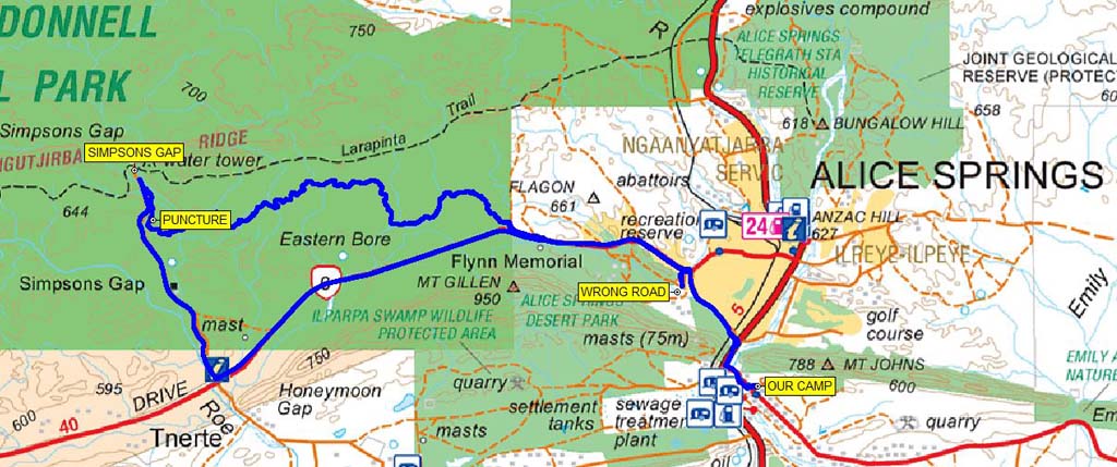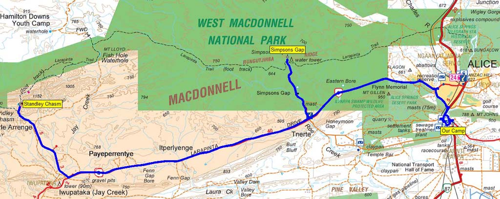 Our route to Standley's Chasm and Simpsons Gap - 123kms return.