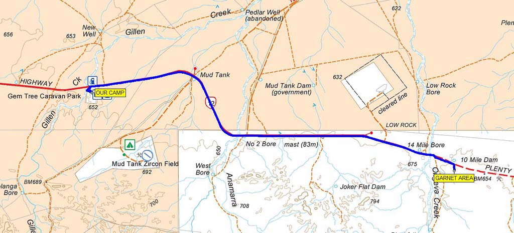Our route to the Gemtree Garnet fossicking area - 61kms round trip.