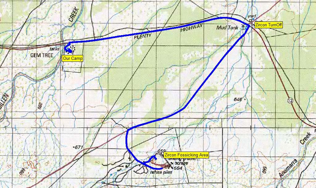 Our route to the Gemtree Zircon fossicking area - 38kms round trip.
