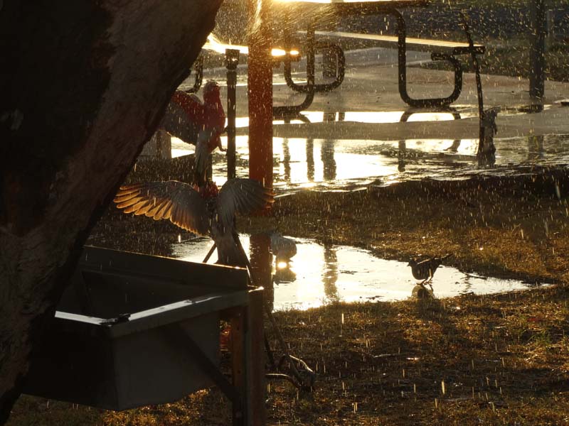 The galahs playing ON the sprinkler.