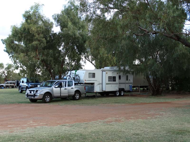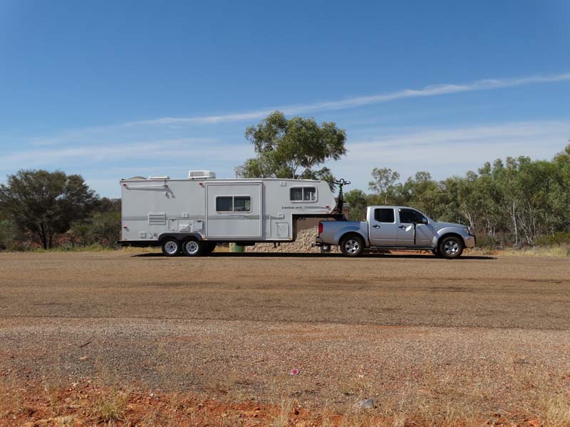 What a night, it PISSED Down. I was buggered and went to bed about 8pm, left Marg sitting up watching her Tv shows. Just after midnight, I felt some drops of water on me. It was BUCKETing down outside, it appeared that the water was pooling on the roof and sneaking into the hatch above us. Marg suggested lowering the front of the fiver. SO I waited until the rain stopped and then got up walked outside and the first thing I felt was all that dry RED dirt was now oozing between my toes. I lowered the front legs and created a beautiful waterfall off the front of the fiver. While up I thought that I would check the powercord, it was high and dry. SO all good, I washed the mud off my feet and went back to bed. Problem solved, no more drips. We both slept until 7am, when we woke to a sunny morning with no rain to be seen BUT heaps of oozing mud everywhere.