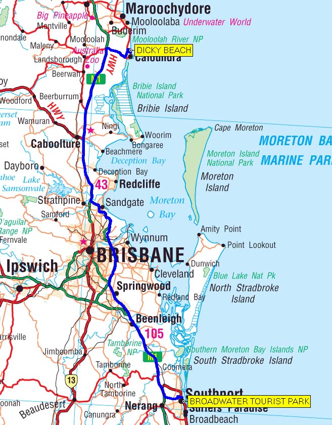 Our route from Southport to Dicky Beach - 168 kms.