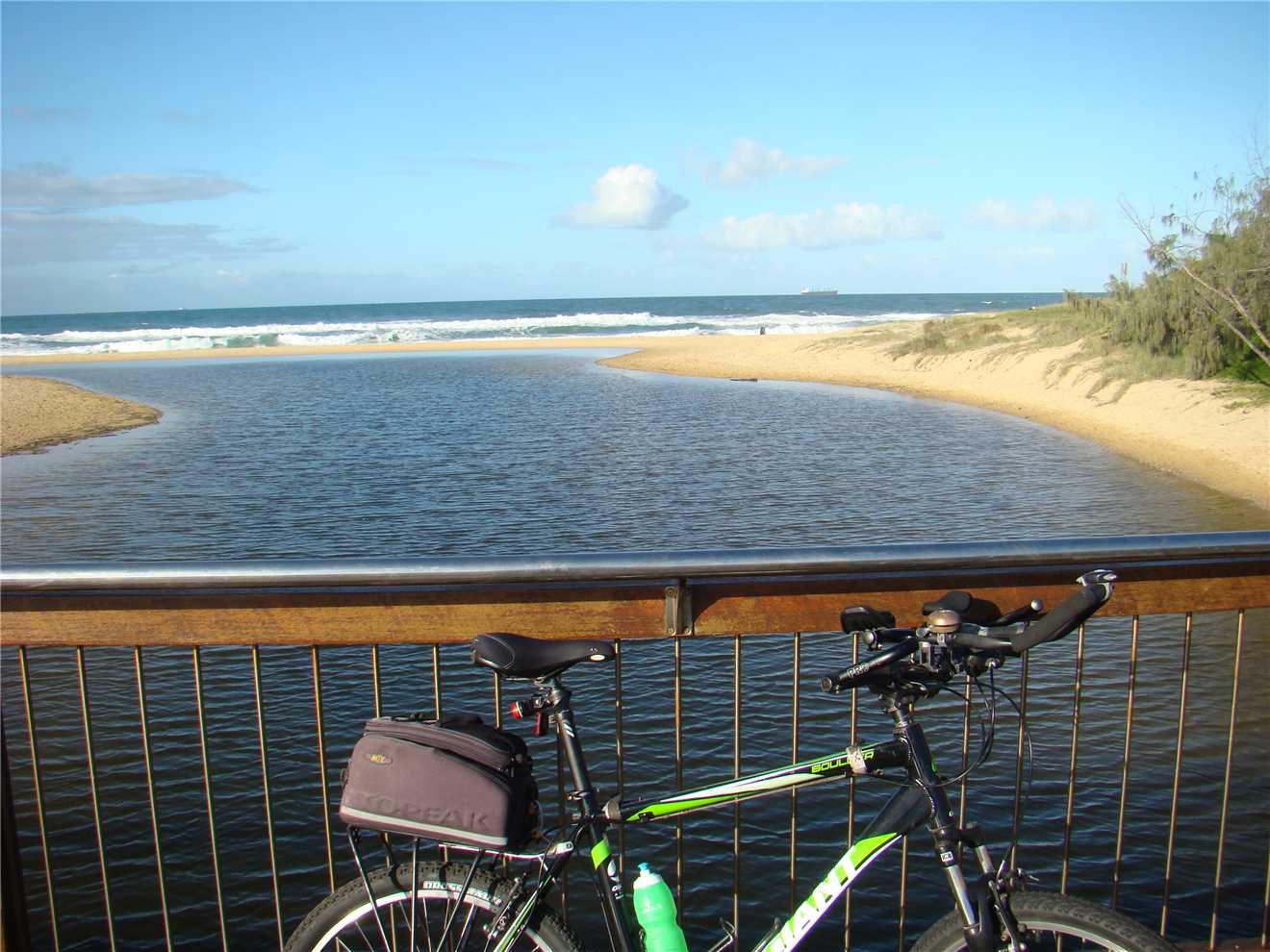 I headed along the shared path past the Dicky Beach SLSC along the back streets to Currimundi Lake. Along a shared path to Nicklin Way, over the bridge along another shared path beside the north side of the Lake, following the path for 1-2 kms then along the back streets to Oceanic Drv then into Pacific Blvd which takes you to the Lighthouse or instead of going along Pacific Blvd you can choose the shared paths. I usually ride along the roads until I reach the Lighthouse then turn around and ride back along the road to Oceanside where I turn around and head back to the Lighthouse. Stopping at the Lighthouse for my usual daily weather photos, then I roll down the BIG HILL and ride out to the end of the "Spit" (mouth of the Mooloolaba river), where I sit and take in the wonderful vistas and eat my bananas. Then ride back UP THE BLOODY BIG HILL back to the Lighthouse then back to along the shared paths (where available) back to camp. Usually about 47kms.