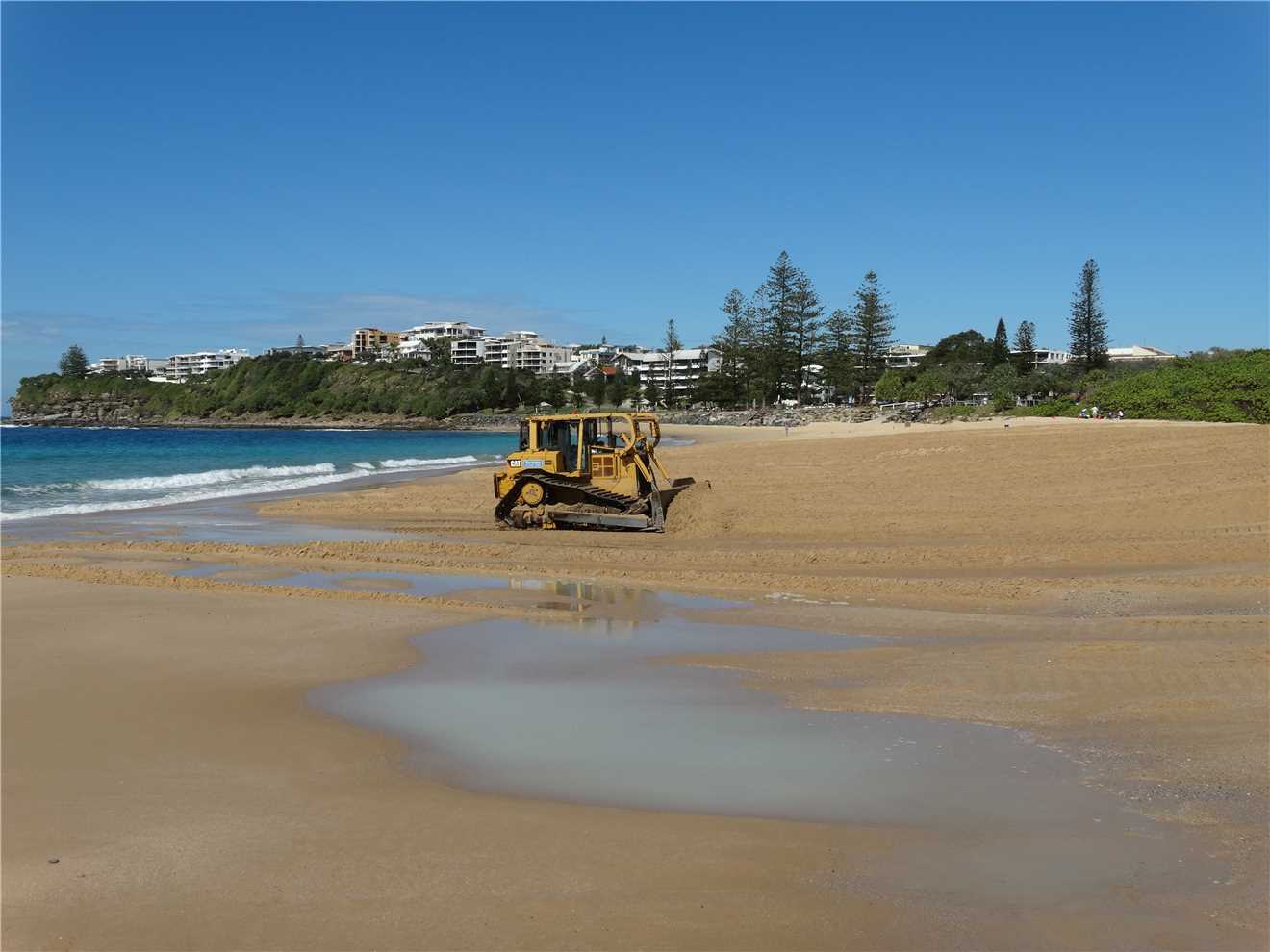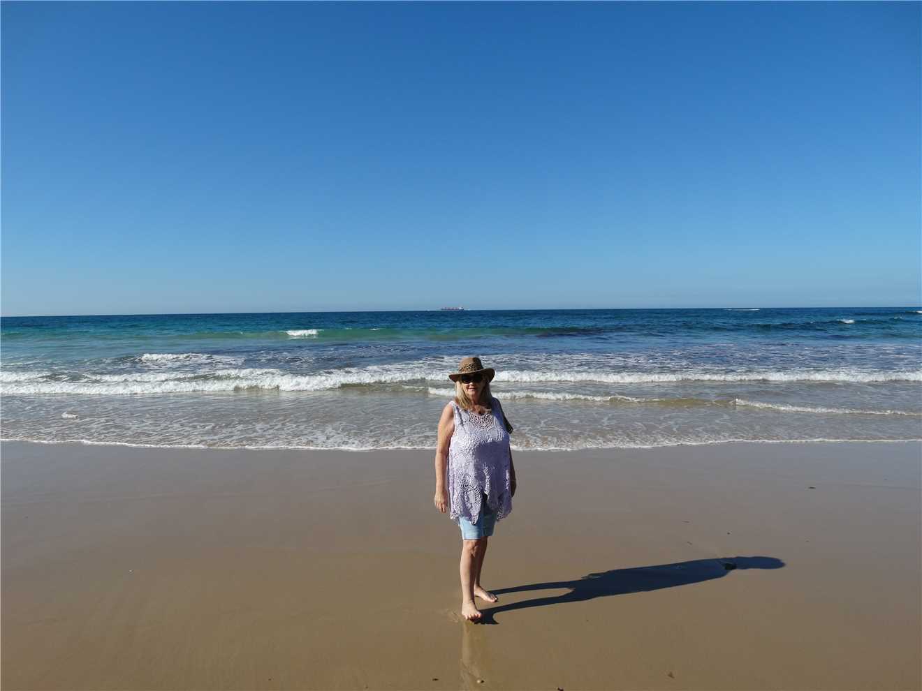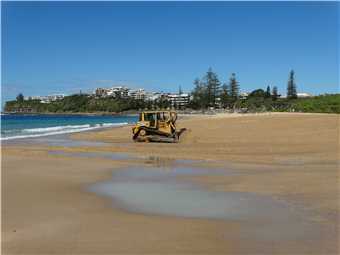 After I showered, Marg and I walked over to the Dicky Beach Bakery and sat in the shade and watched the world go by, while we drank our coffees and read the Herald Sun on our iPads. When we finished, we dropped our iPads back at camp and then walked along the beach heading south towards Caloundra. We watched a bulldozer 'push' sand along the beach at Tooway creek. After a few minutes watching the bulldozer, we sat on the rocks and just watched the waves crash over the rocks.