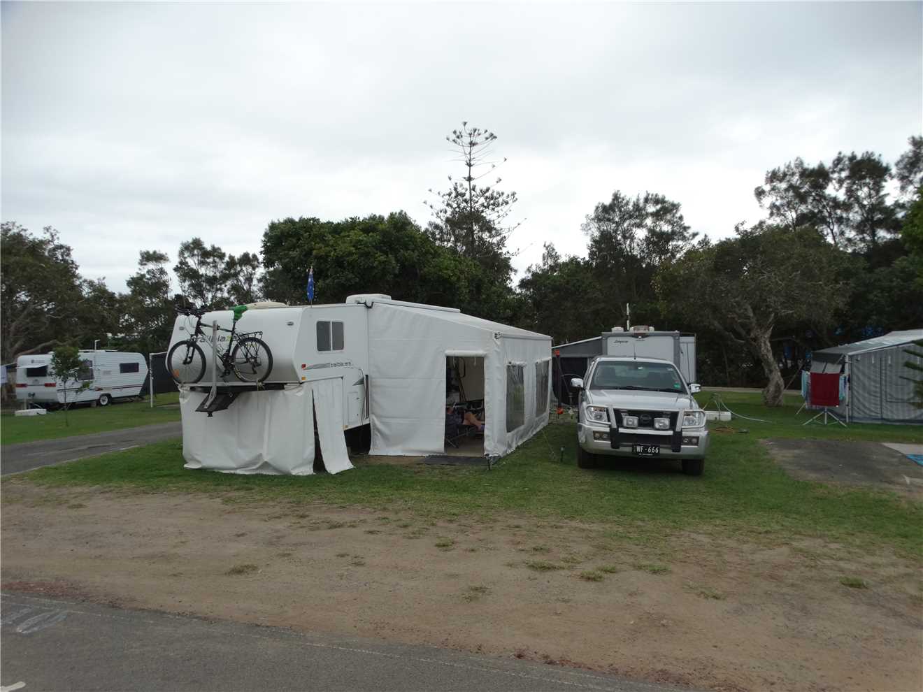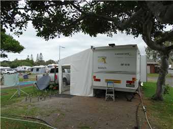Back at camp, I started to pack up outside. First job was to empty the shitter, then roll up the awning, fold up the ends and side and skirt, pack away the clothesline etc. By the time I had finish the sweat was dripping off me. Tomorrow, we don't have much to pack, only Sat Dish, and hoses and Marg's naughty room and a few other bits.