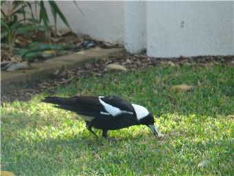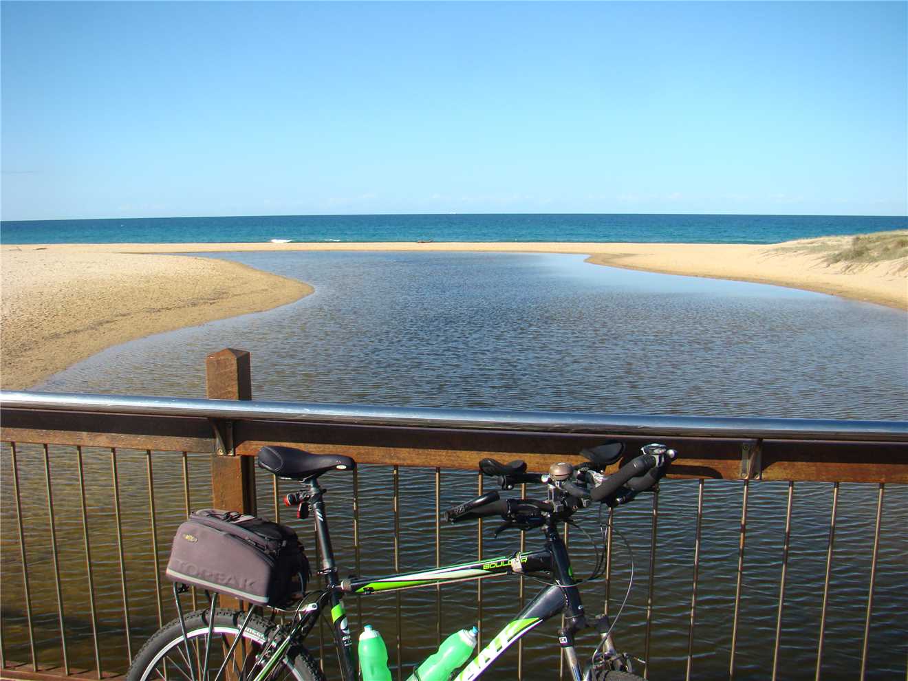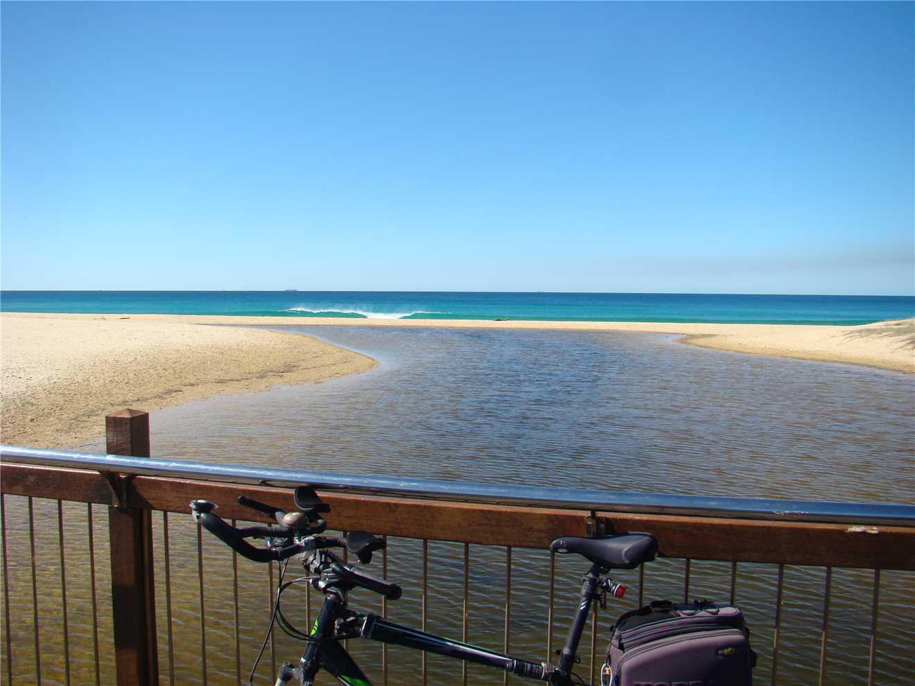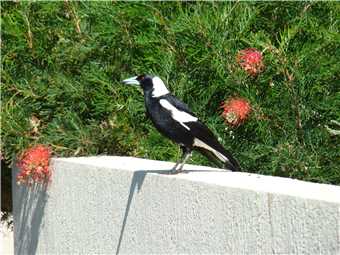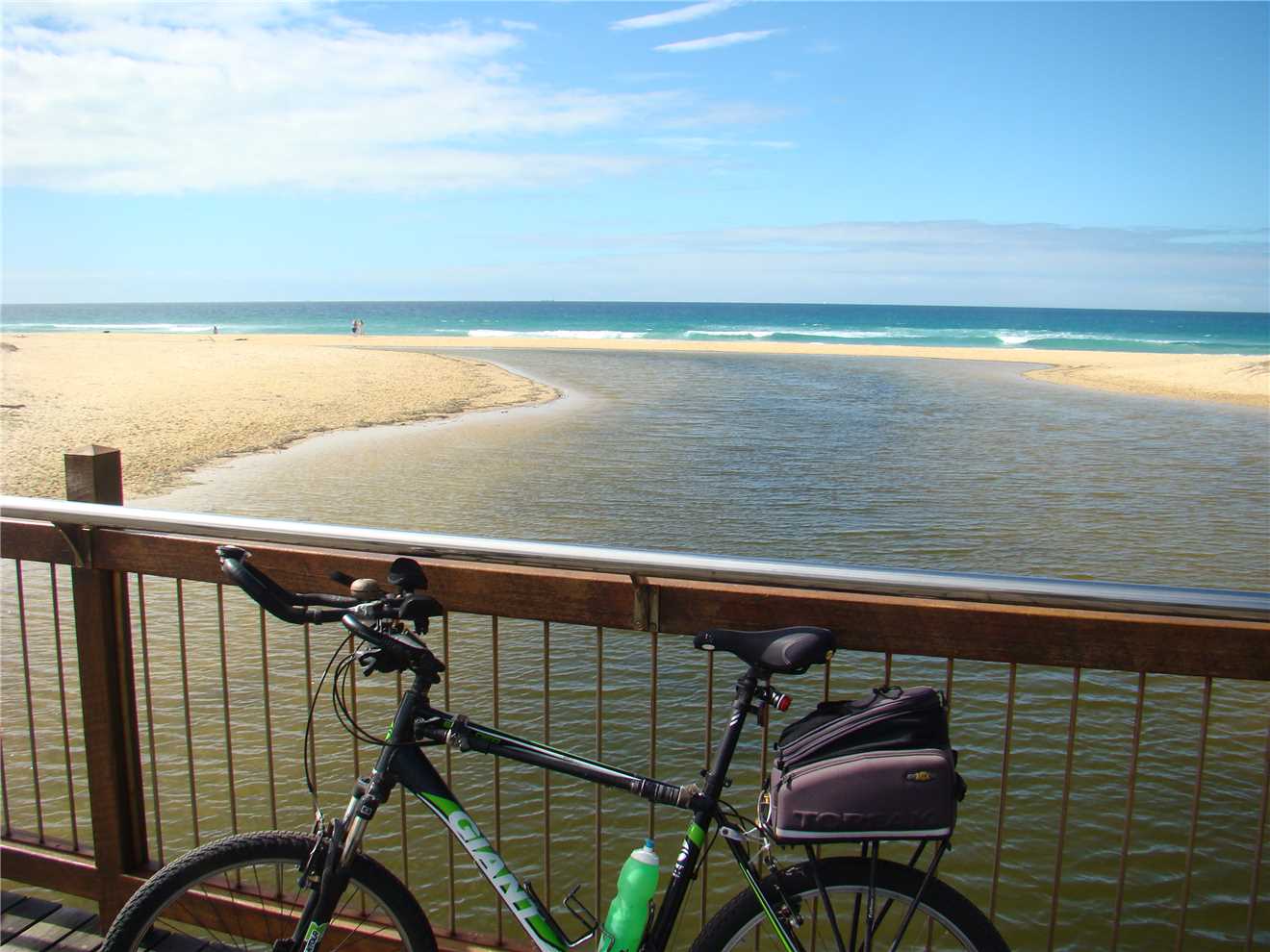camera with me. As I was riding down the Hill from the Lighthouse carpark, I noticed a beautiful magpie sitting on the wooden fence. He was jet black with brilliant white no gray bits. As I approached, he/she flew away, within 10 seconds there was a thud on my helmet and 'maggie' flew off. Within the next 30 seconds there were 2 attempts to strike me but it missed. I continued on my way back to camp and stopped at the Dicky Beach bakery for a coffee before arriving home at 3:12pm after 47.7kms.