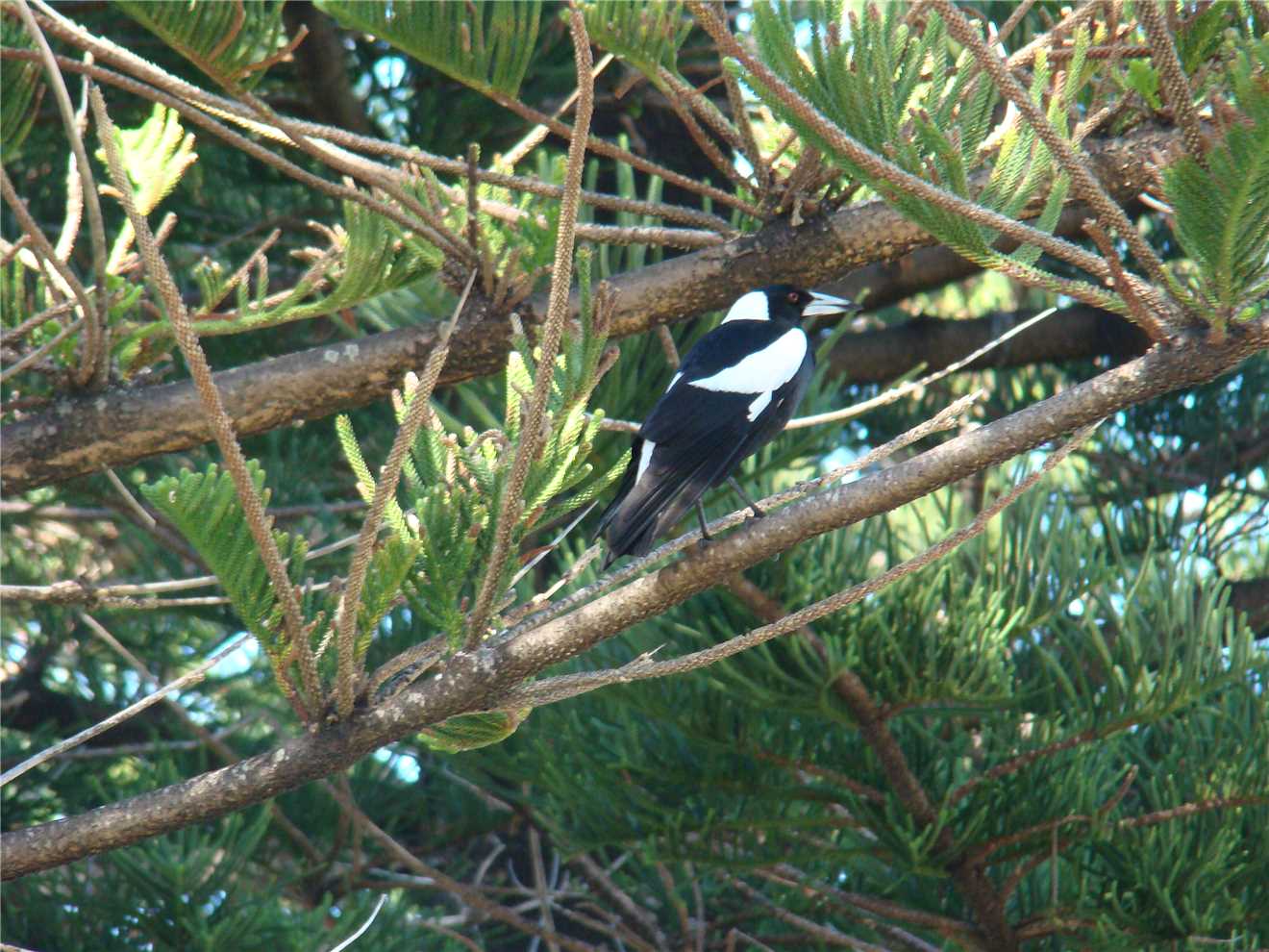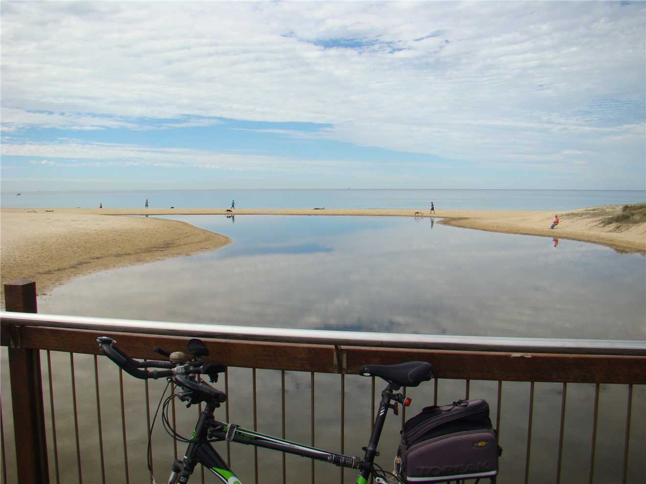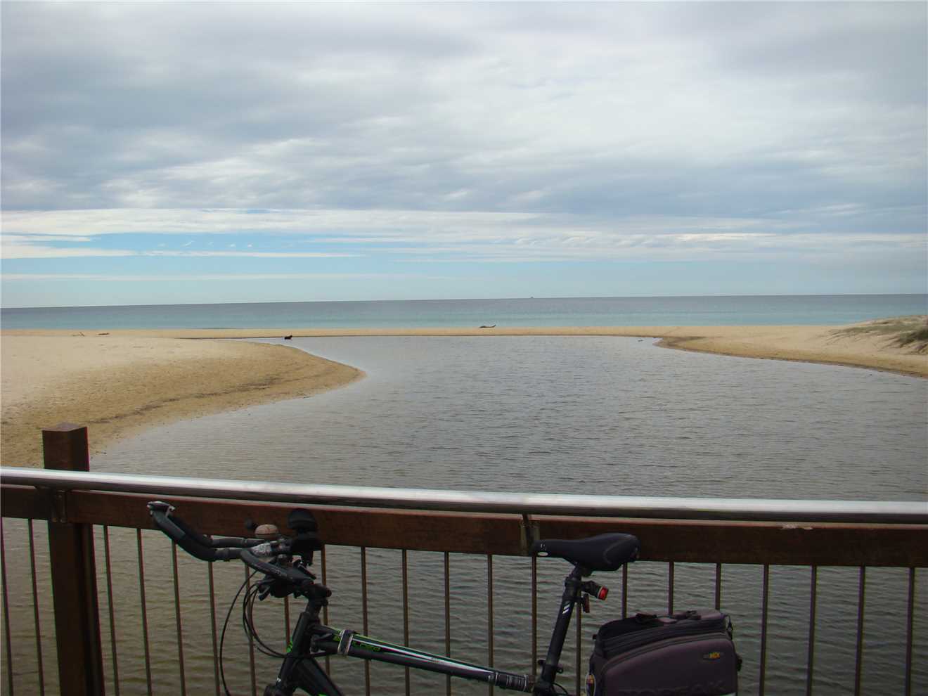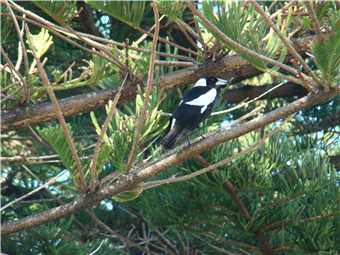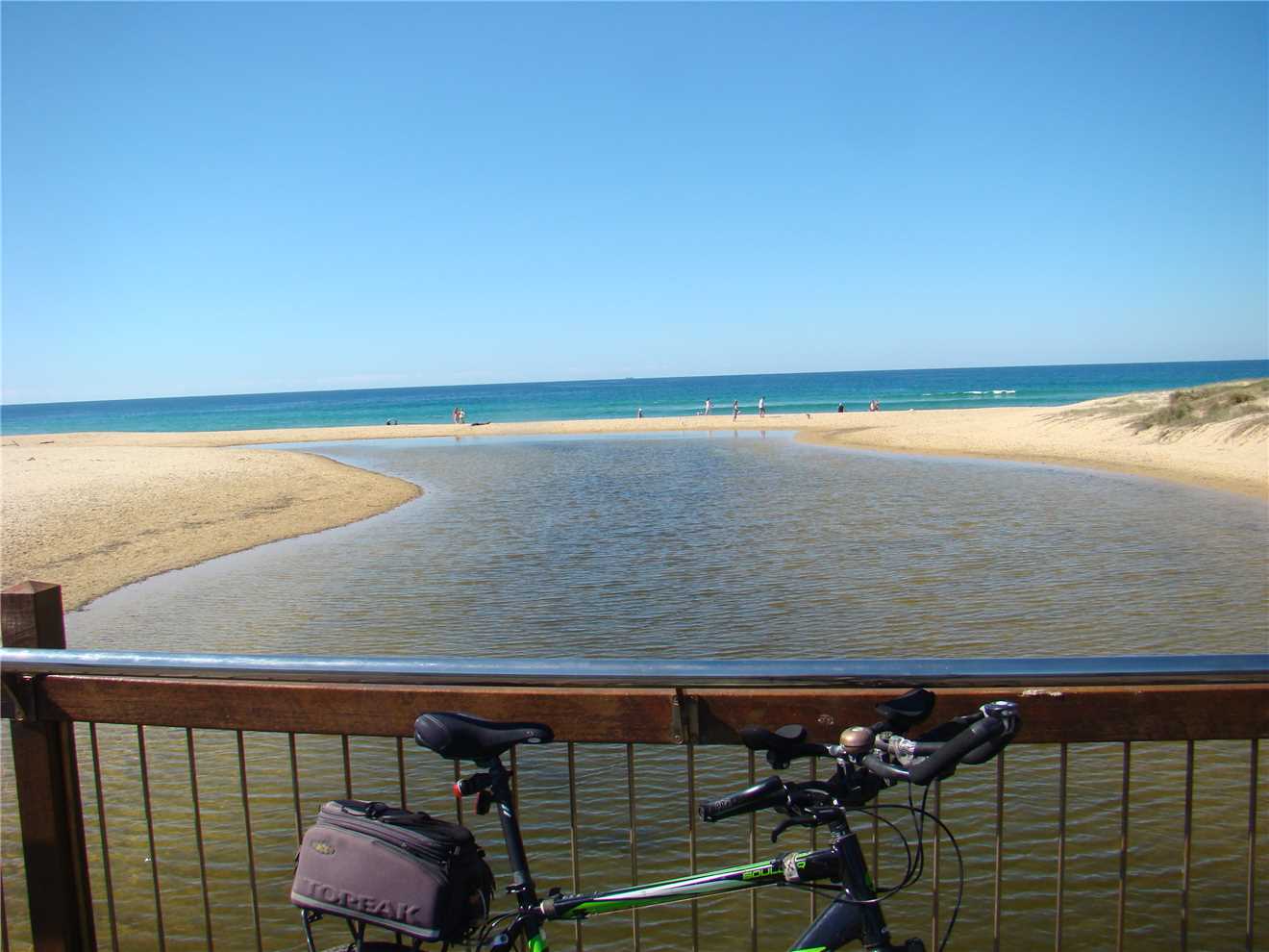 camera with me. As I was riding down the Hill from the Lighthouse carpark, I noticed a beautiful magpie sitting on the wooden fence. He was jet black with brilliant white no gray bits. As I approached, he/she flew away, within 10 seconds there was a thud on my helmet and 'maggie' flew off. Within the next 30 seconds there were 2 attempts to strike me but it missed. I continued on my way back to camp and stopped at the Dicky Beach bakery for a coffee before arriving home at 3:12pm after 47.7kms.