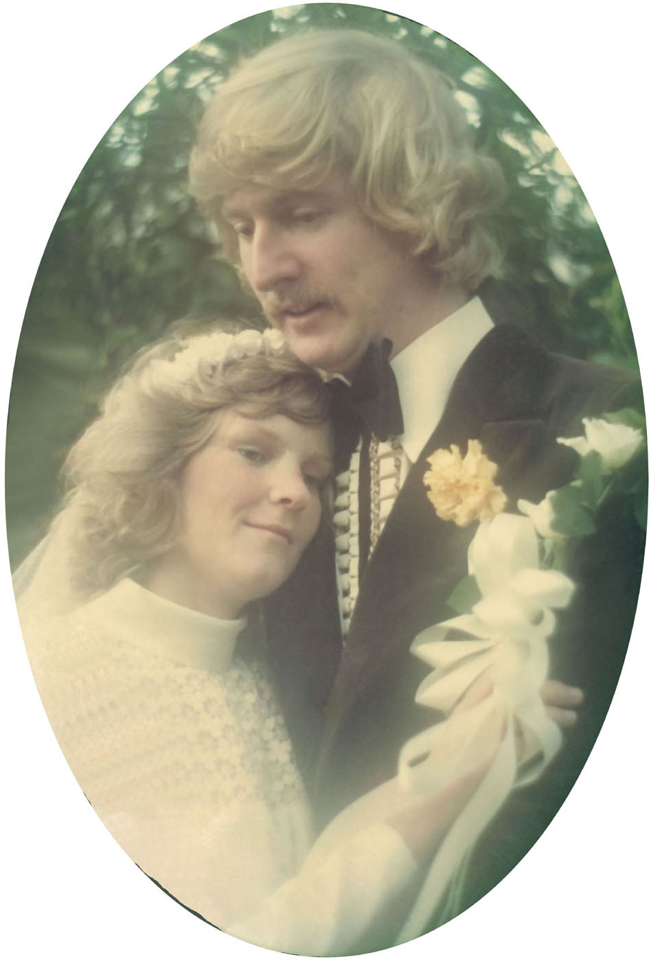 Marg was in a beautiful wedding gown while I was in a brown velvet suit.