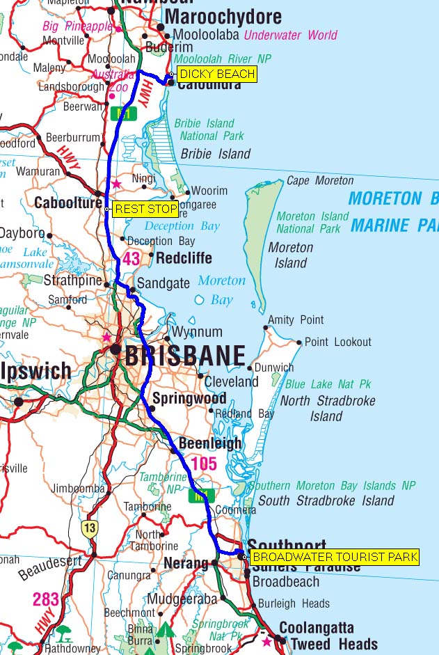 Our route from Dicky Beach to Southport - 168 kms.