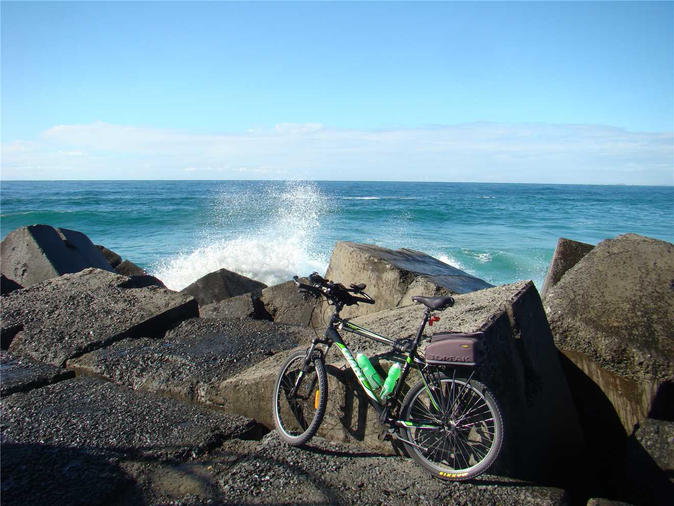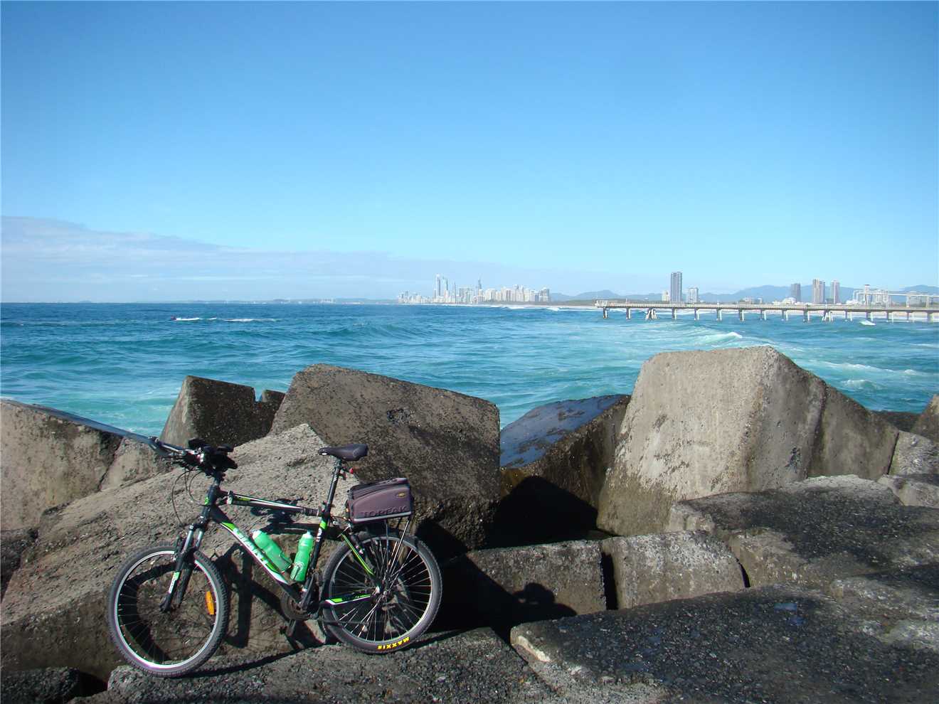 I decided on the BIG ride of approx 56kms. I rode out of the park and headed North to Lands End and then South to Burleigh Heads Bluff, where I photographed the surfers before heading North again and stopped at Surfers to take my daily weather photos then headed via the Federation 'gravel' Walk out to The Spit and then stopping for coffee at Kamal's Cafe Rockpool.
