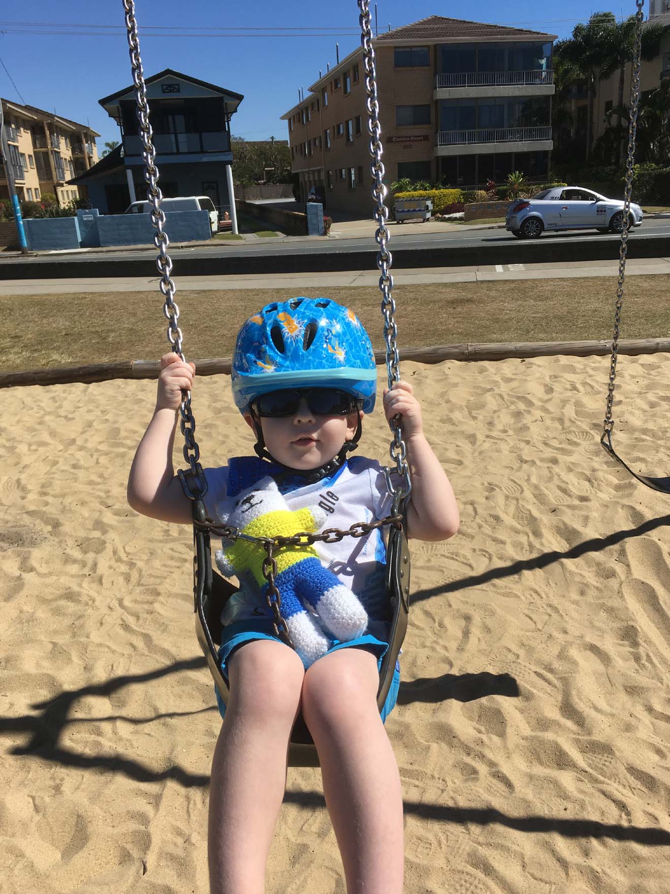 Mase on the swing. Notice teddy bear.
