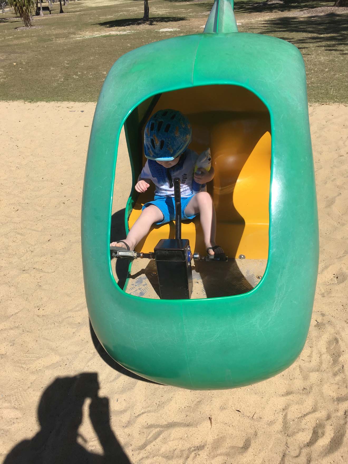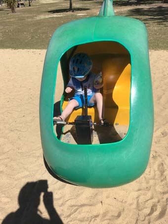 Same as yesterday, we stopped at numerous playgrounds where Mase tested various play equipment, which included a helicopter, slides and swings. We also stopped at cafe Rockpool, where 'B' toasted some raisin bread for Mase and me a coffee. We were moving on the bike for 1hr 22min and away from camp for 2hr 12min, arriving back at camp at 1:27pm.