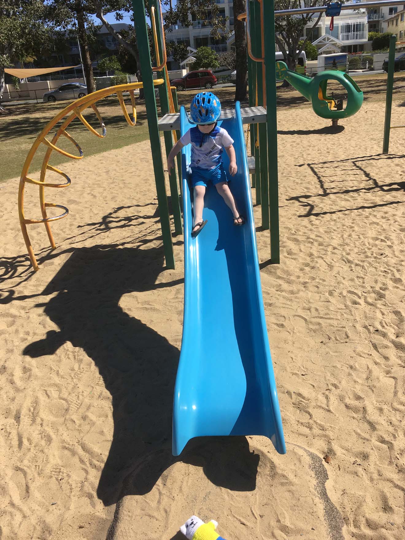 Mase on the slide. Notice teddy bear.