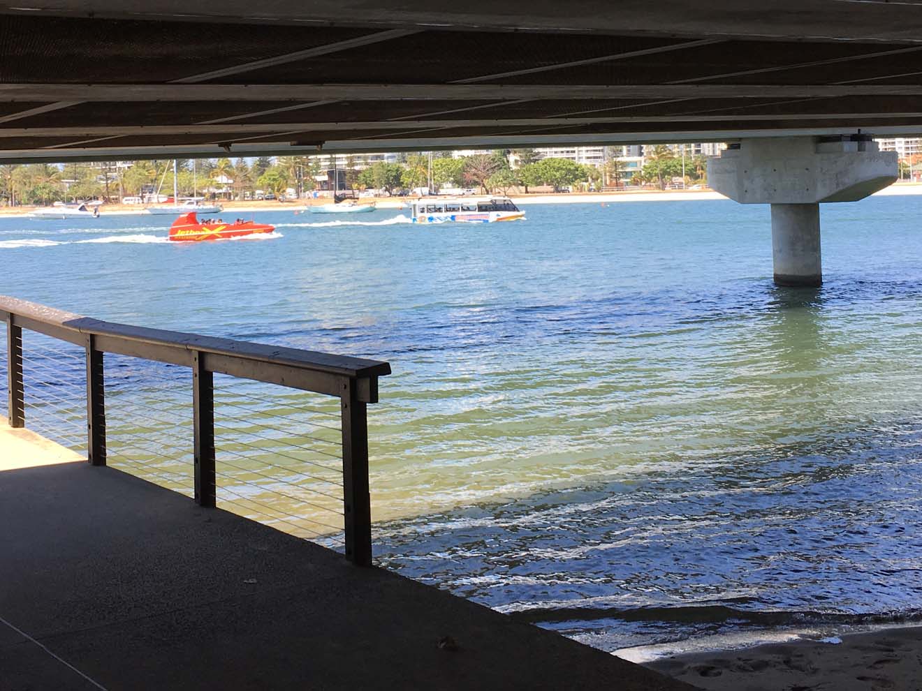 to see dolphins in the Broadwater and so close to shore. SO we 'raced' the AquaDuck and the dolphins heading towards the Bridge. We rode over the