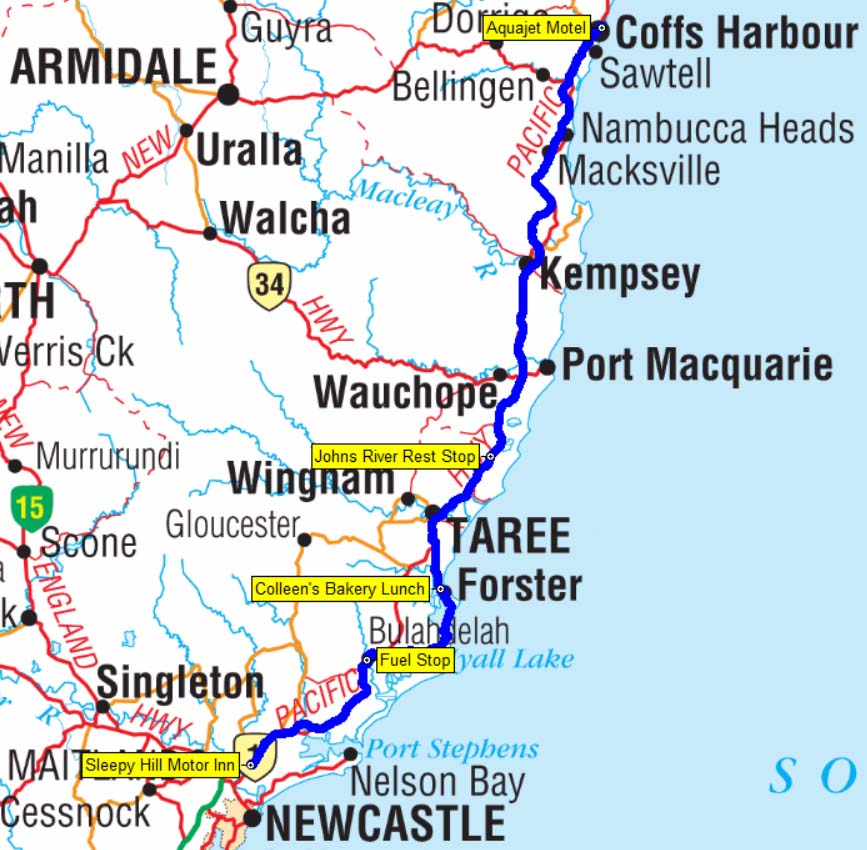Our route from Coffs to Raymond Terrace, NSW - 395 kms.
