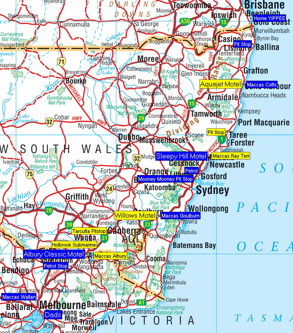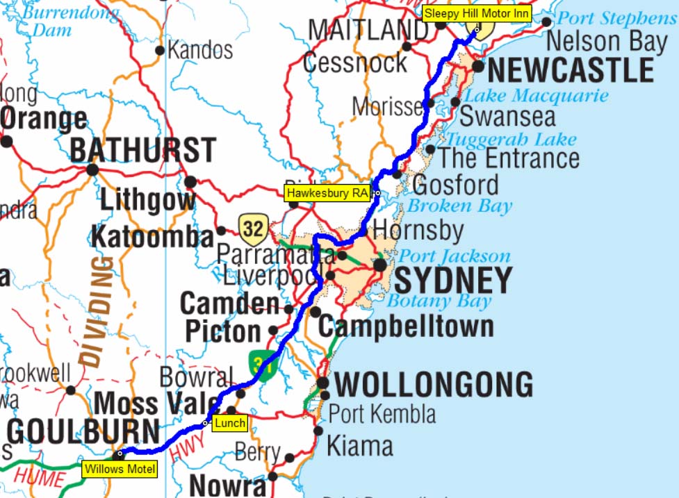 We left Goulburn at 8:33am and headed for the Sleepy Hill Motel, Raymond Terrace.