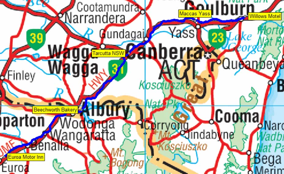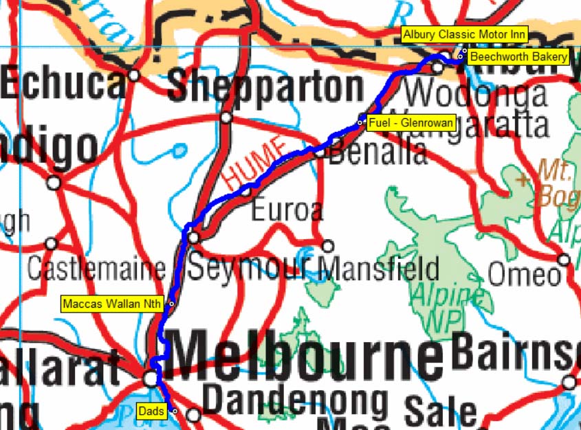 Our route from Goulburn to Euroa - 528 kms.