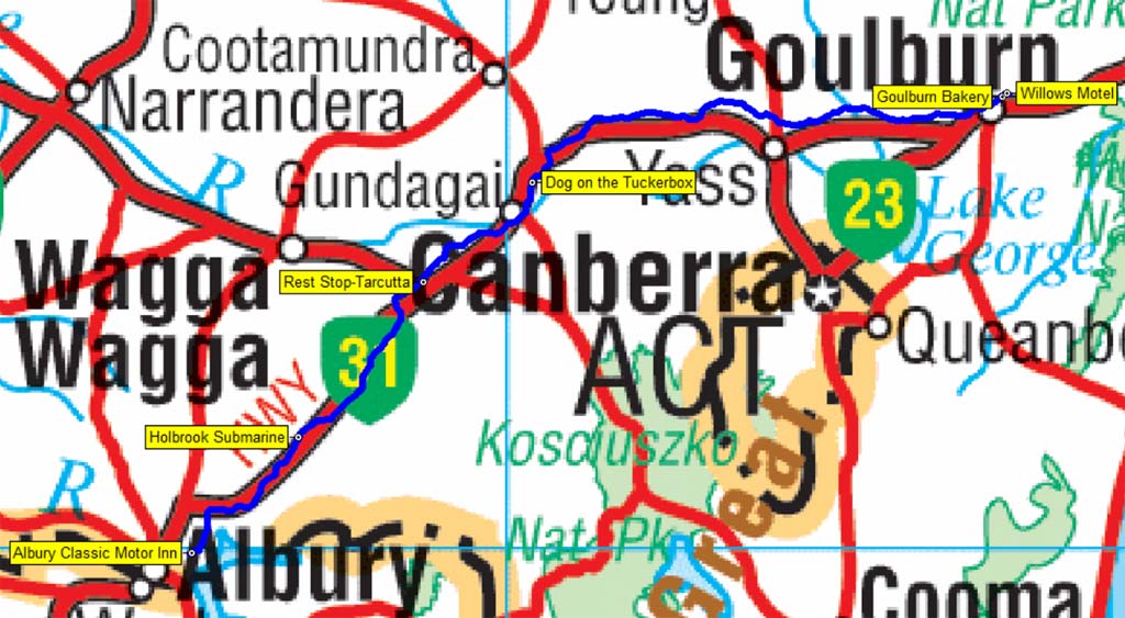 Our route from Albury to Goulburn - 358 kms.
