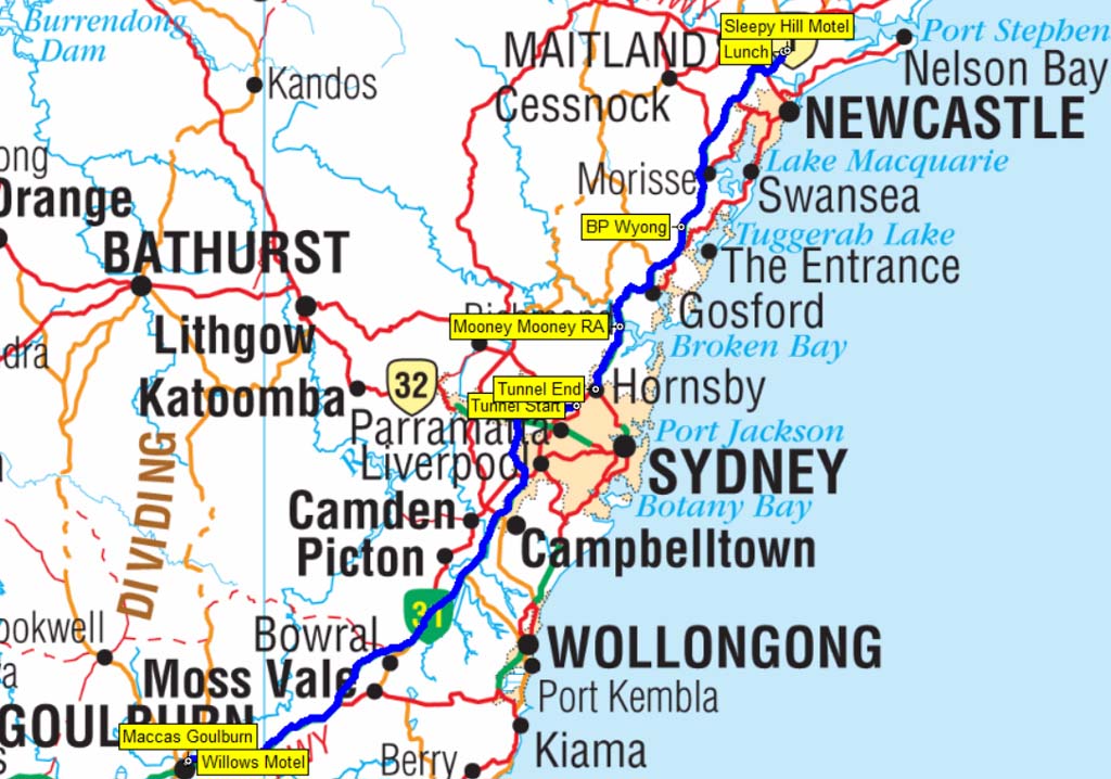 Our route from Goulburn to Raymond Terrace - 344 kms.