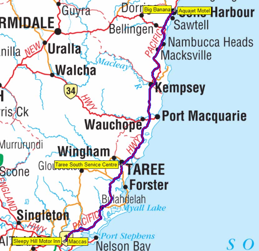 We left Raymond Terrace at 8:42am and headed for the Aquajet Motel, Coffs Harbour.