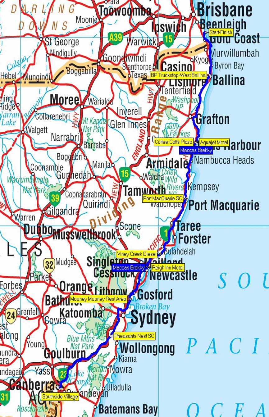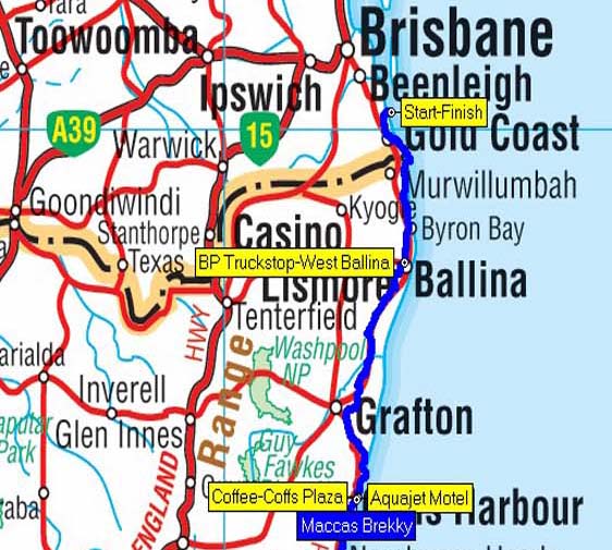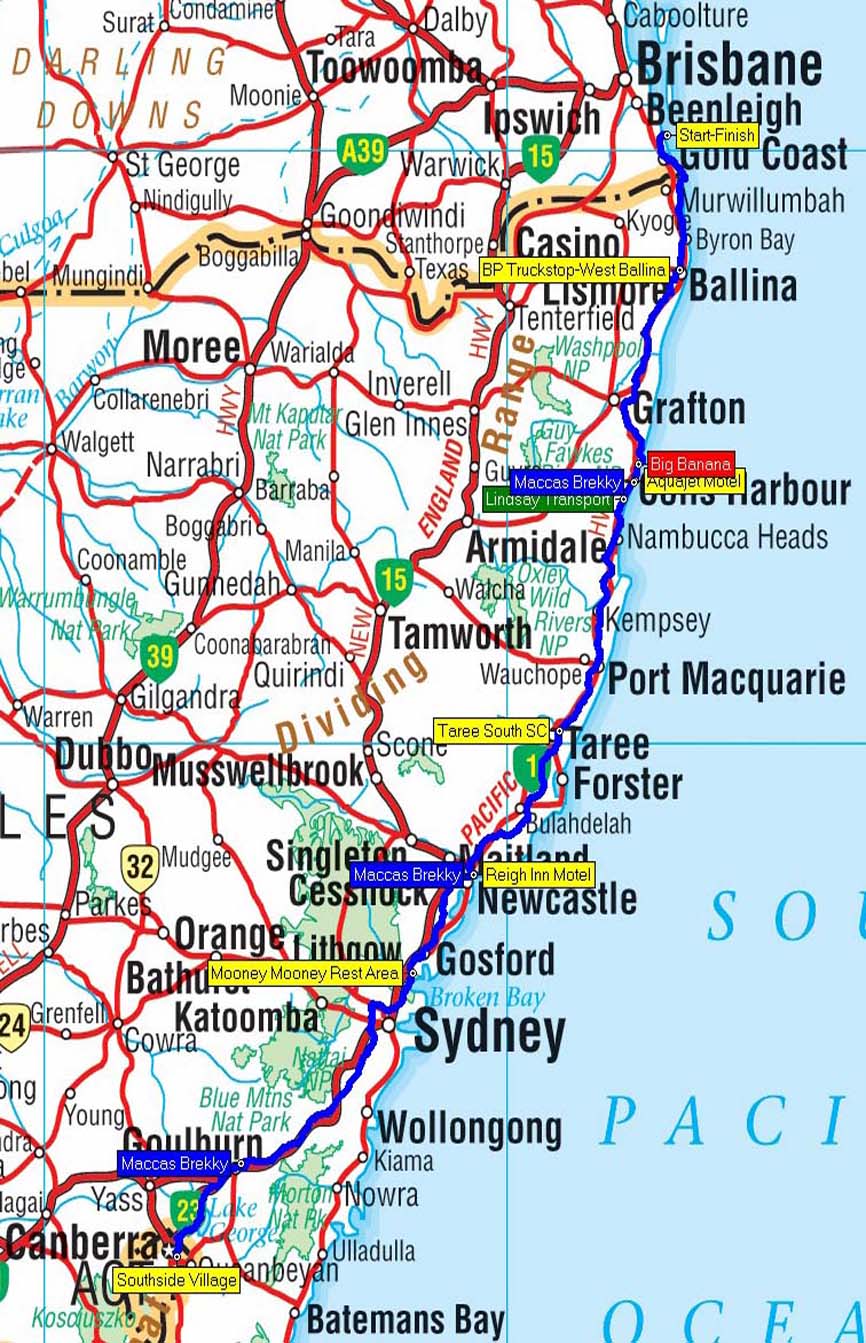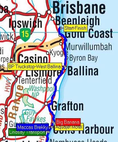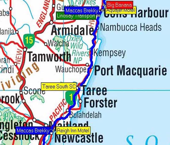 Our route from Reign Inn to Aquajet Motel, Coffs, NSW - 390 kms.