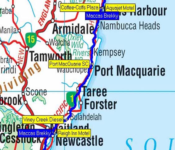 Our route from Coffs to Reign Inn Motel, Newcastle, NSW - 381 kms.