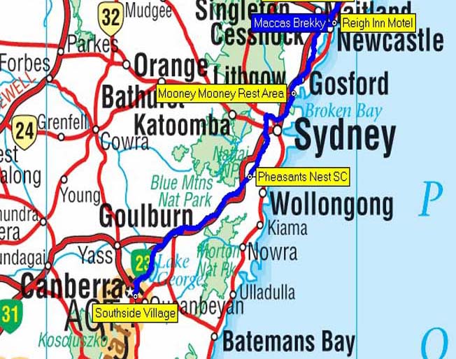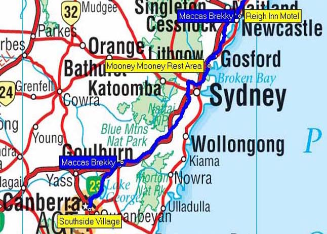 Our route from Canberra to Reign Inn Motel, Newcastle, NSW - 446 kms.
