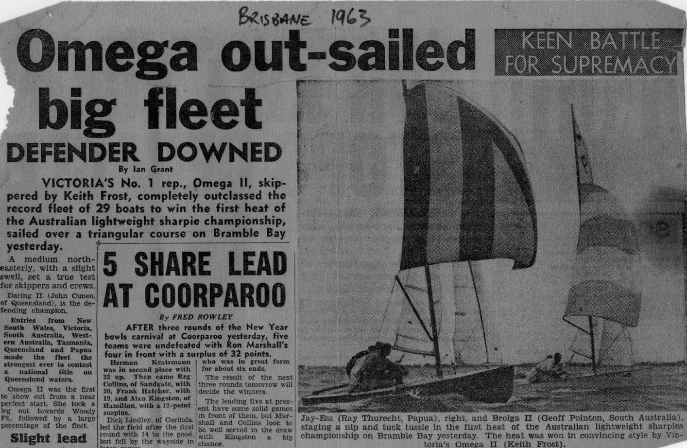 In 1959 the Heavyweight Sharpies at Black Rock were dominated by Impala, sailed by Porky Newman. In most club races in that season the crew of Impala were in the clubhouse having a beer by the time Frosty finished the race. Frosty and his crew provided entertainment for all by frequently capsizing coming past the Cerberus into the harbour. For his efforts, his first sailing trophy was the 'Submarine Trophy'.
