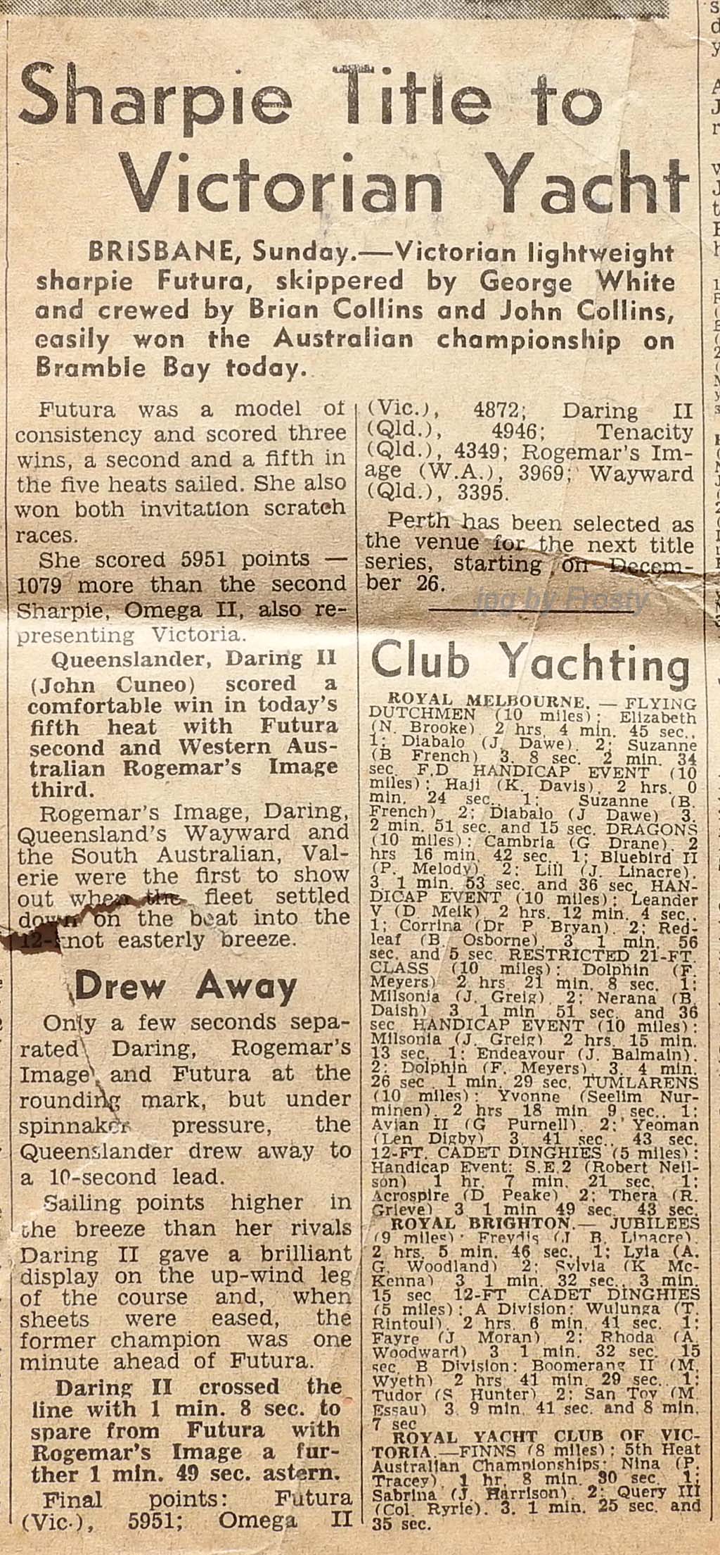 Results taken from Brian's copy and Newspaper articles.