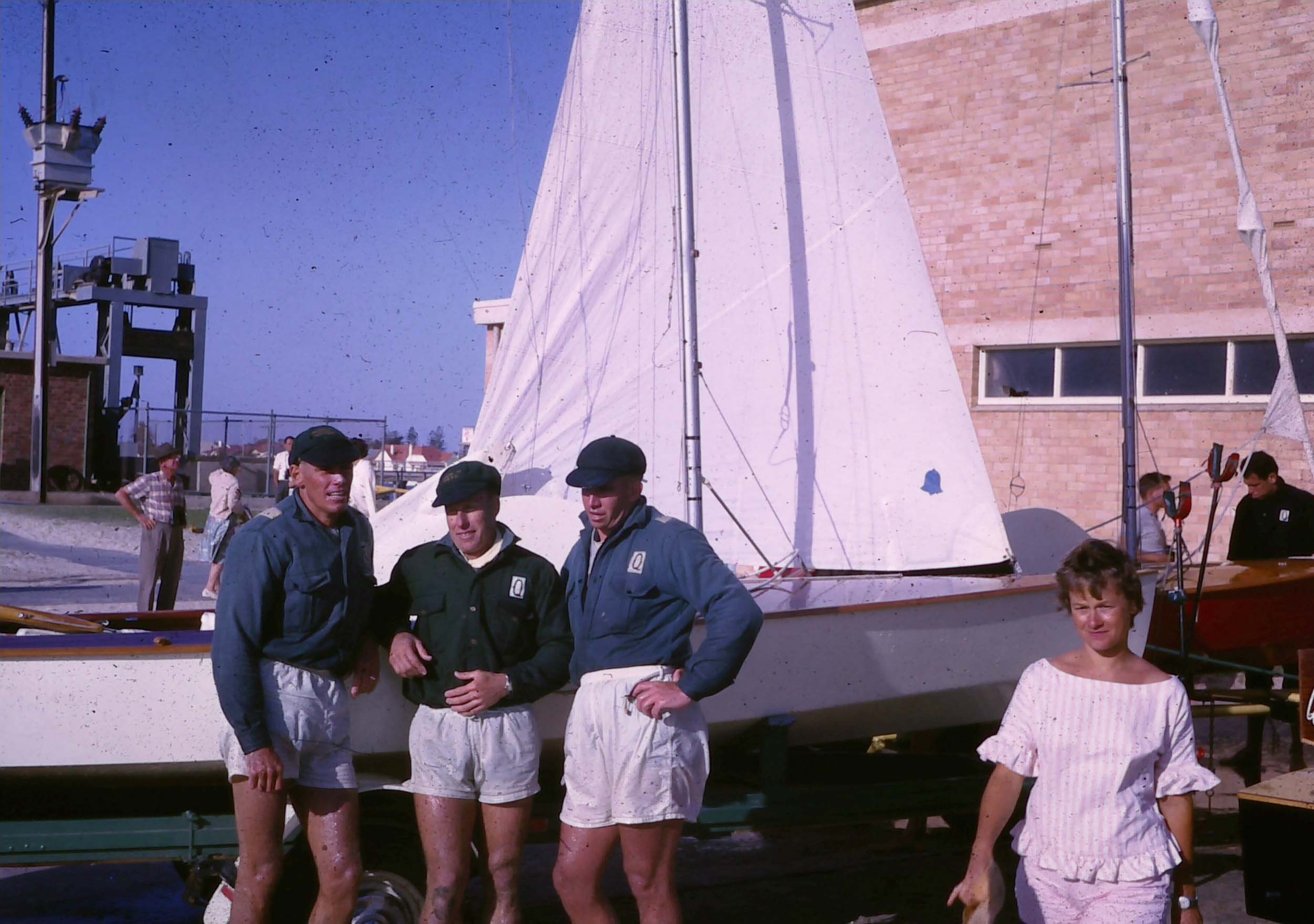 Dad's crew Rolly Newman (right) shirtless in front of the old Glenelg YC.