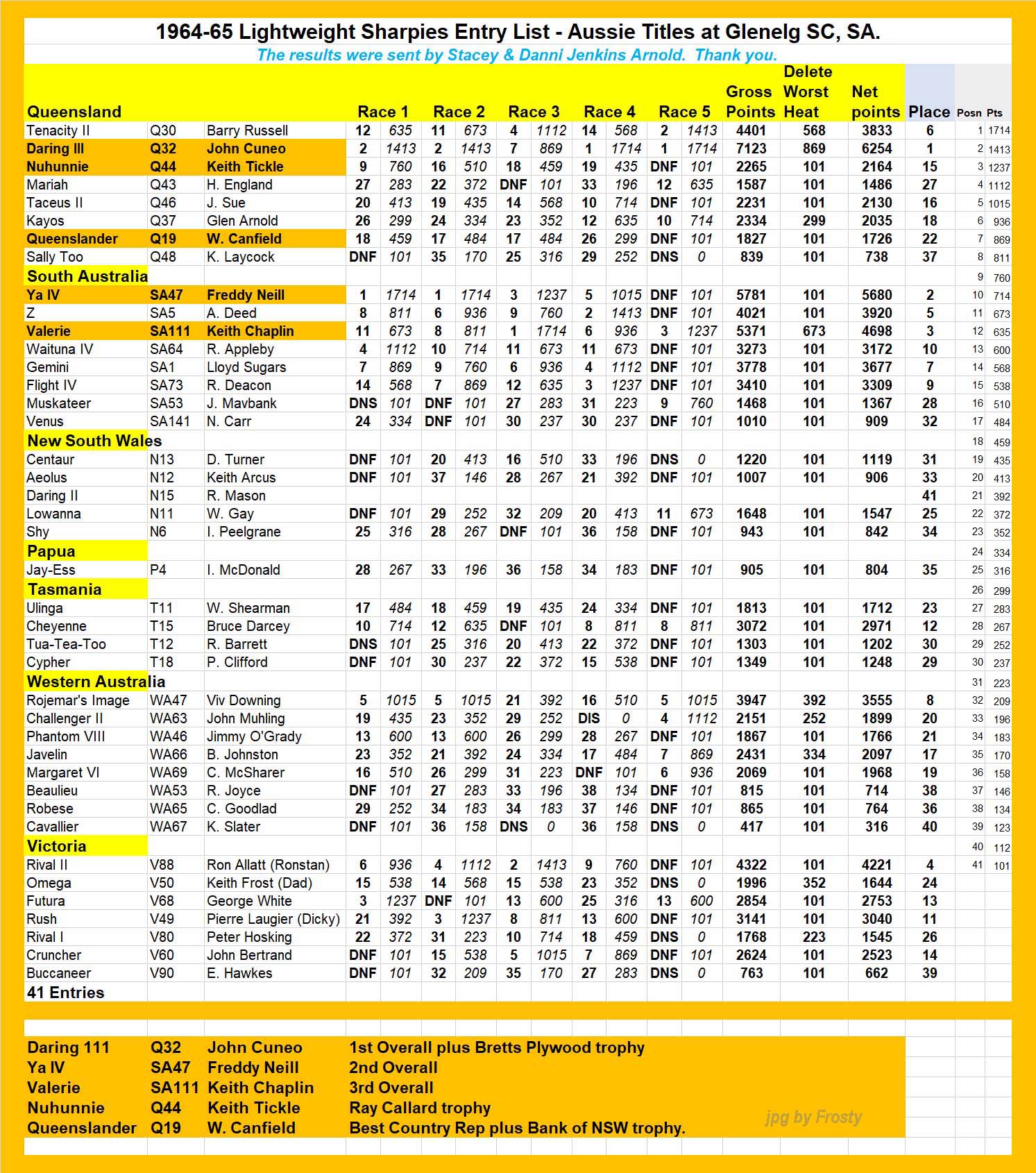 Danni Jenkins Arnold and her husband Stacey supplied the FULL RESULTS...