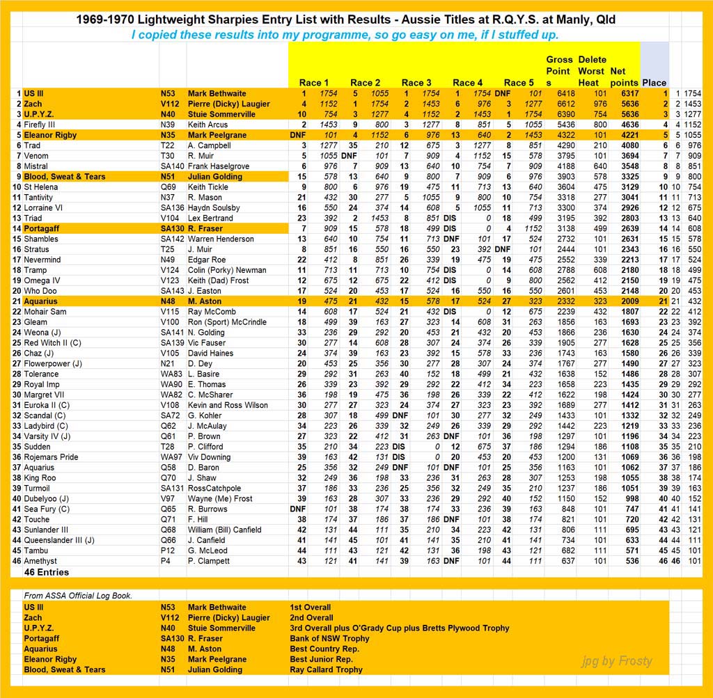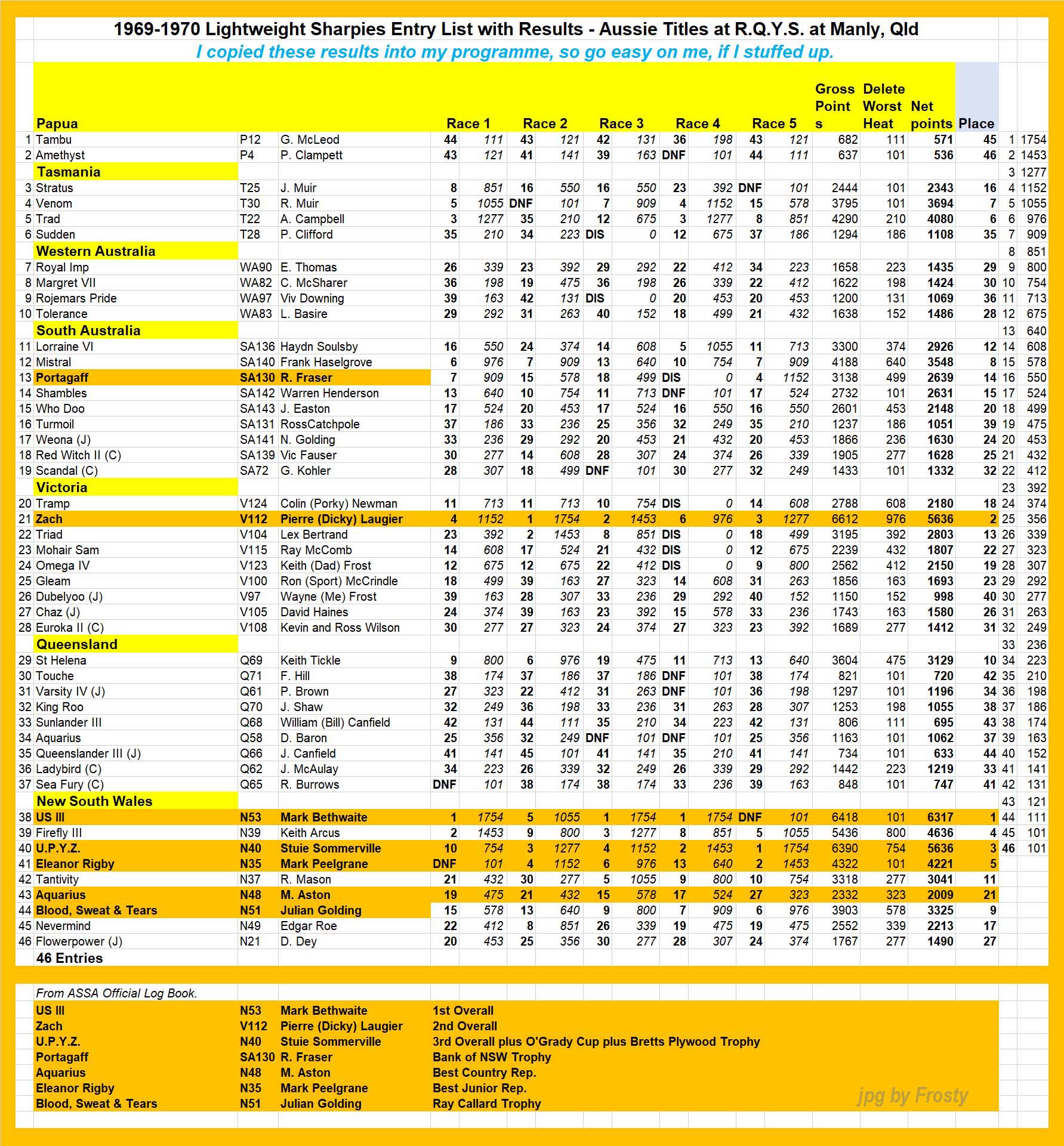 Sailing results: I cannot remember where we finished back it was at the bottom end of the fleet. Can't remember any of Dad's results. Willo may, if so, I will update this page. Update: I finished 39th and Dad finished 20th out of 46 starters. I have the full results which I will add to this page in the future.