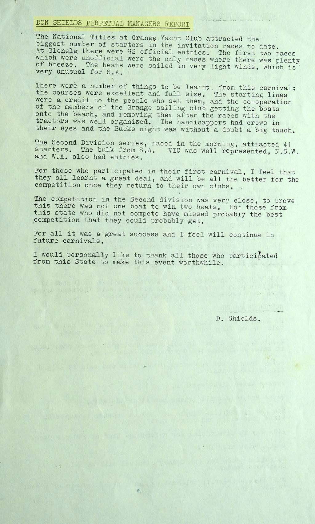 Don Shields' report on the 1st Shields series.