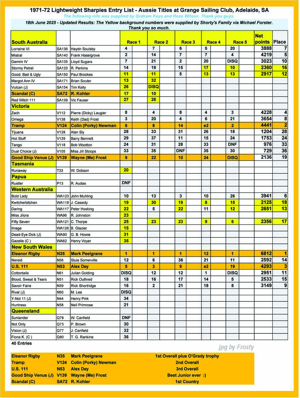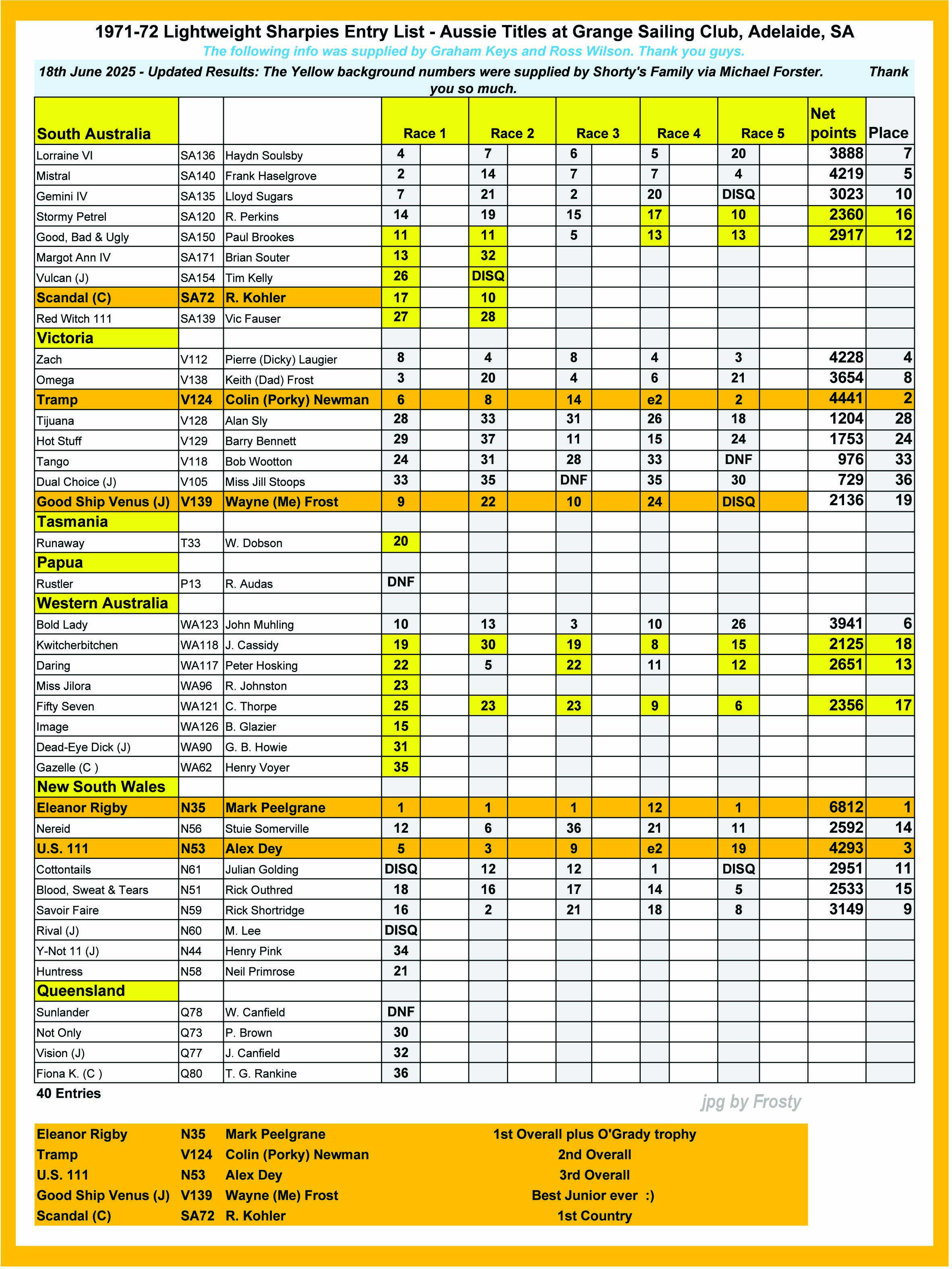 18th June 2025 - Updated Results: The Yellow background numbers were supplied by Shorty's Family via Michael Forster.
