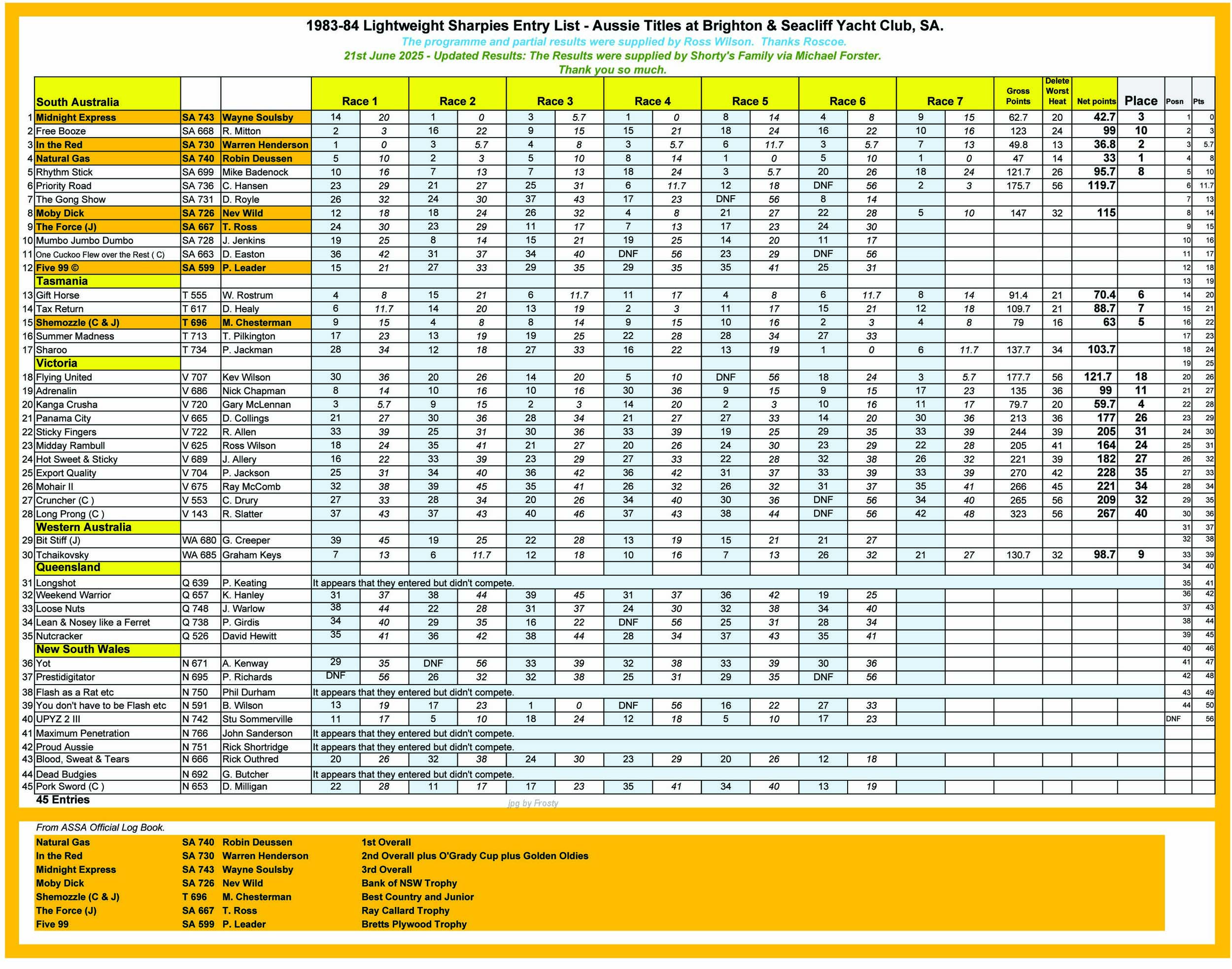 The Results were supplied by Shorty's Family via Michael Forster.