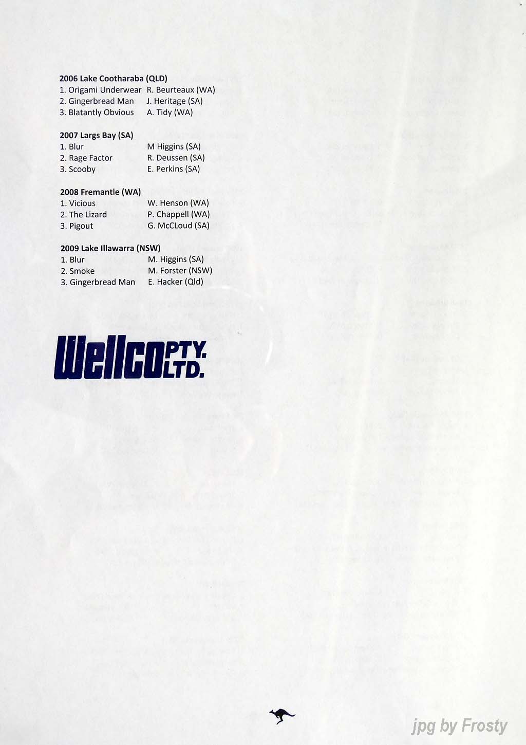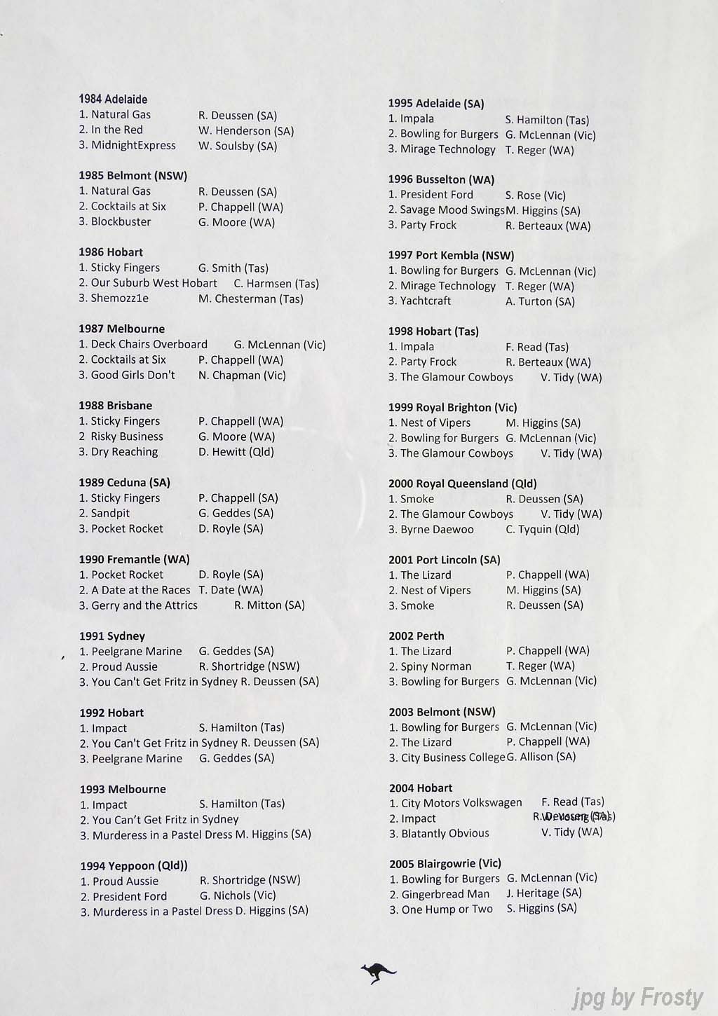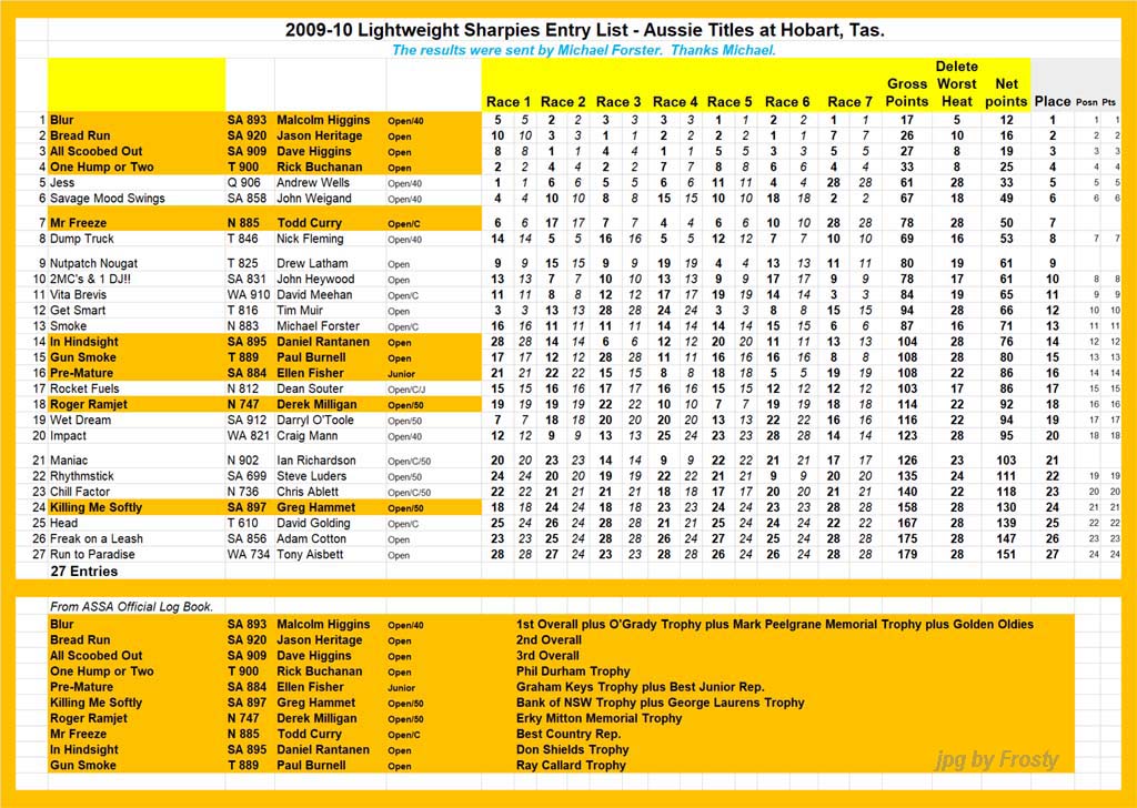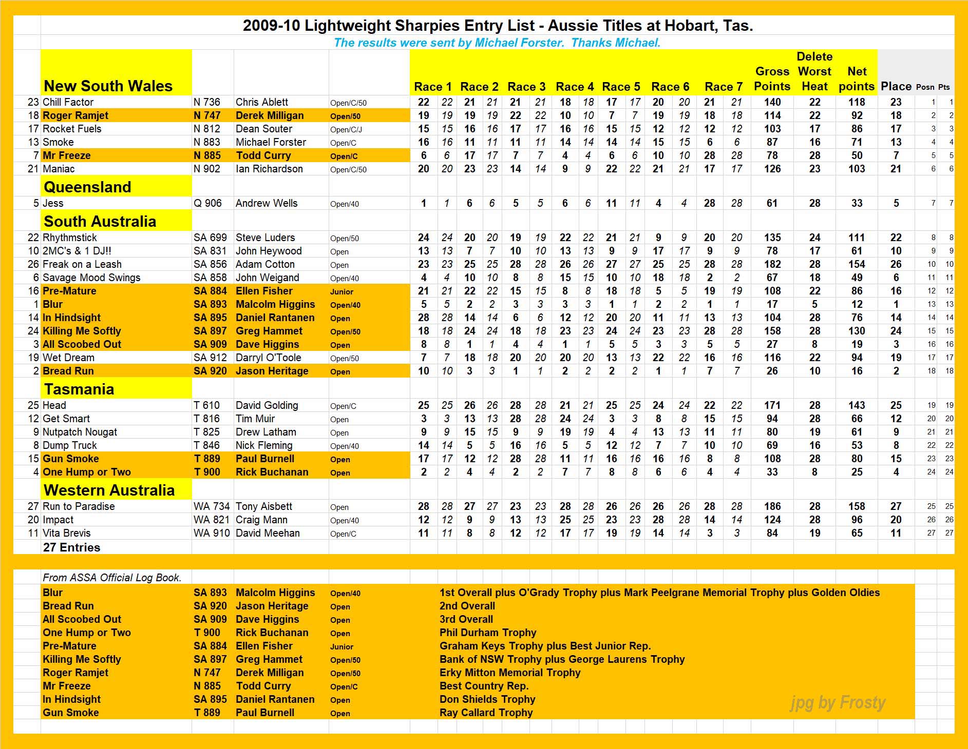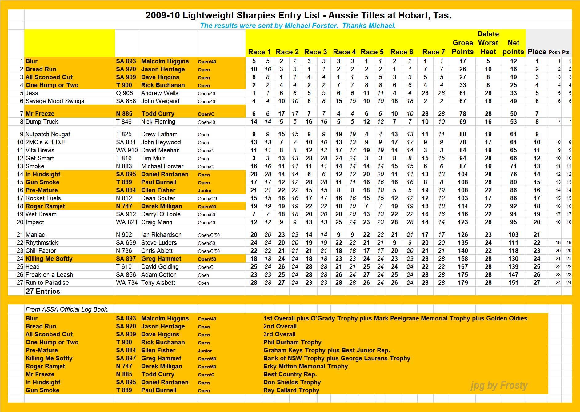The Results were supplied by Michael Forster. Thanks Michael.