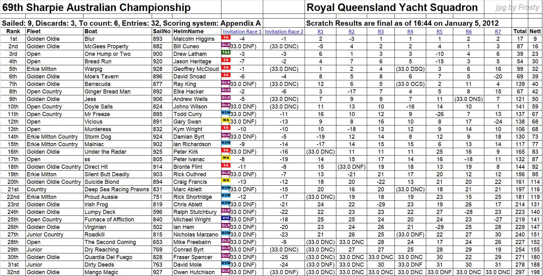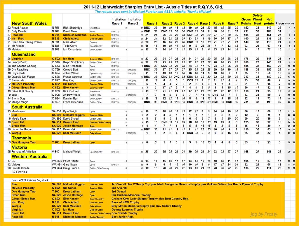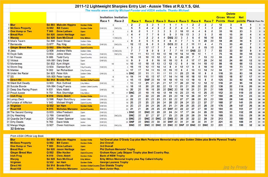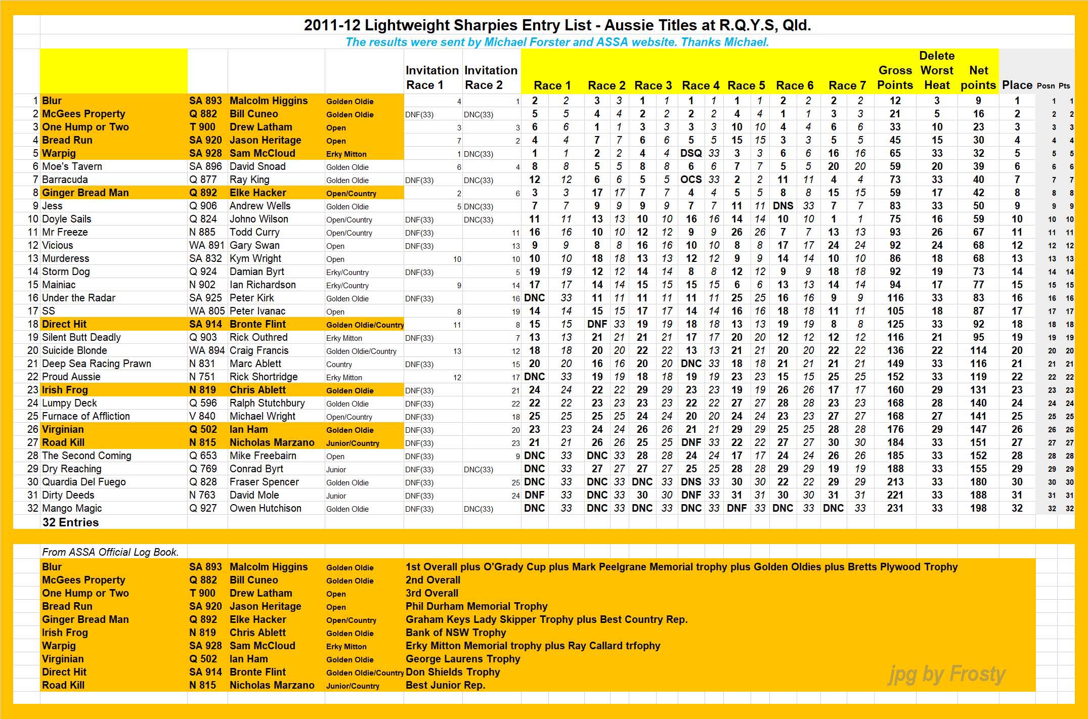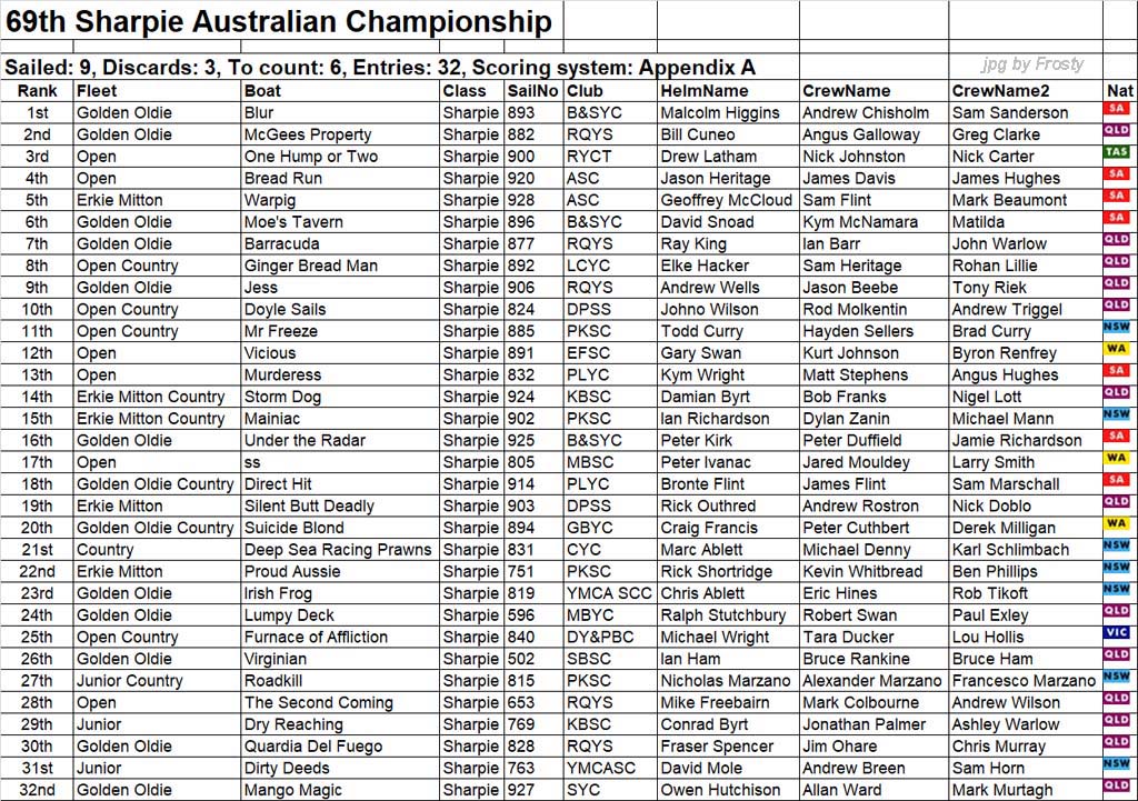 Placings showing Skipper and Crew.