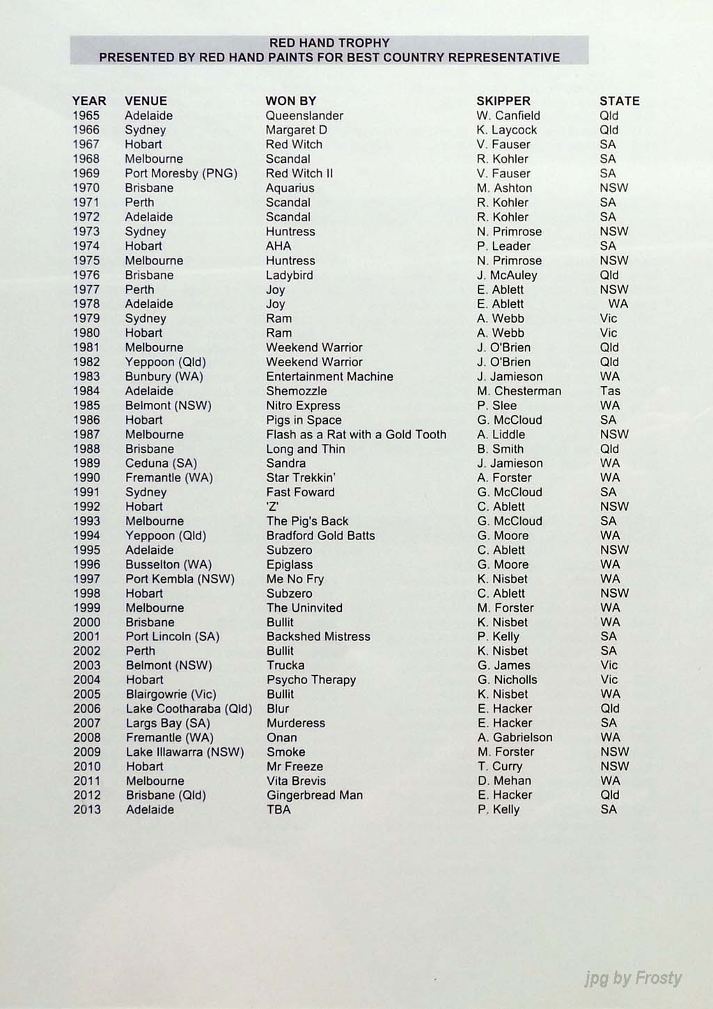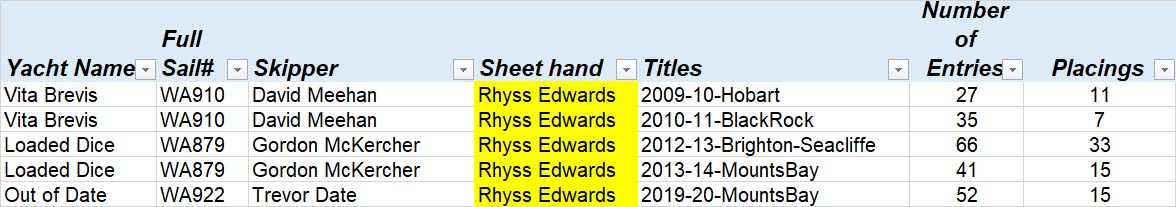 Rhyss sailed in 5 Aussie Titles as mainhand on board the following Sharpies: