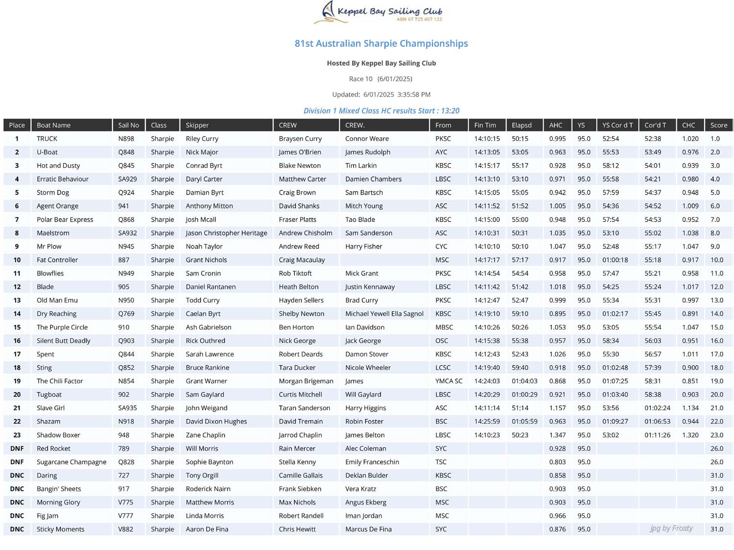 Full Handicap Results for the 10 races.